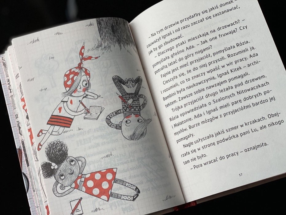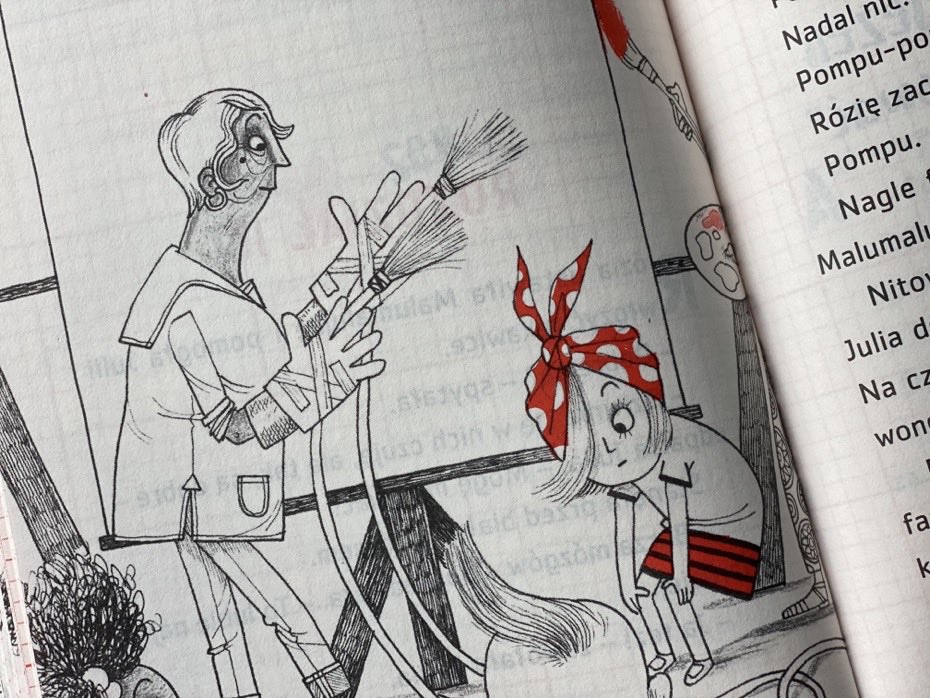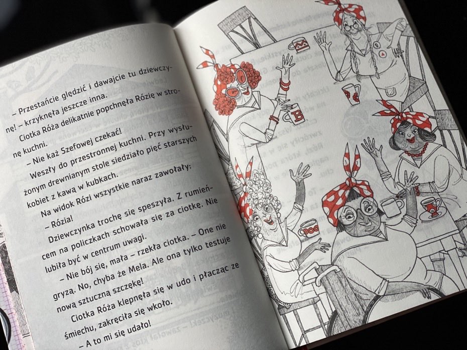Kiedy otworzyłam paczkę, lekko się zdziwiłam. Myślałam, że kolejna część będzie w takiej samej oprawie graficznej i rozmiarze, co poprzednie. Jednak ta jest dużo mniejsza, podzielona na 22 rozdziały z zabawnymi, 2-kolorowymi ilustracjami, w tym własnymi bazgrołami i notatkami Rózi na papierze milimetrowym.