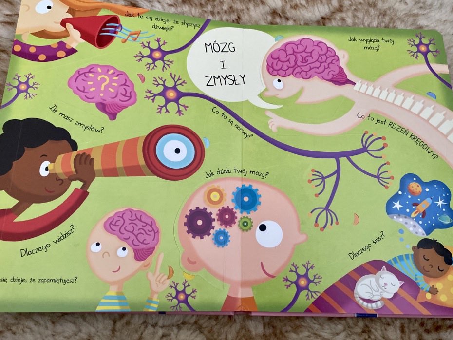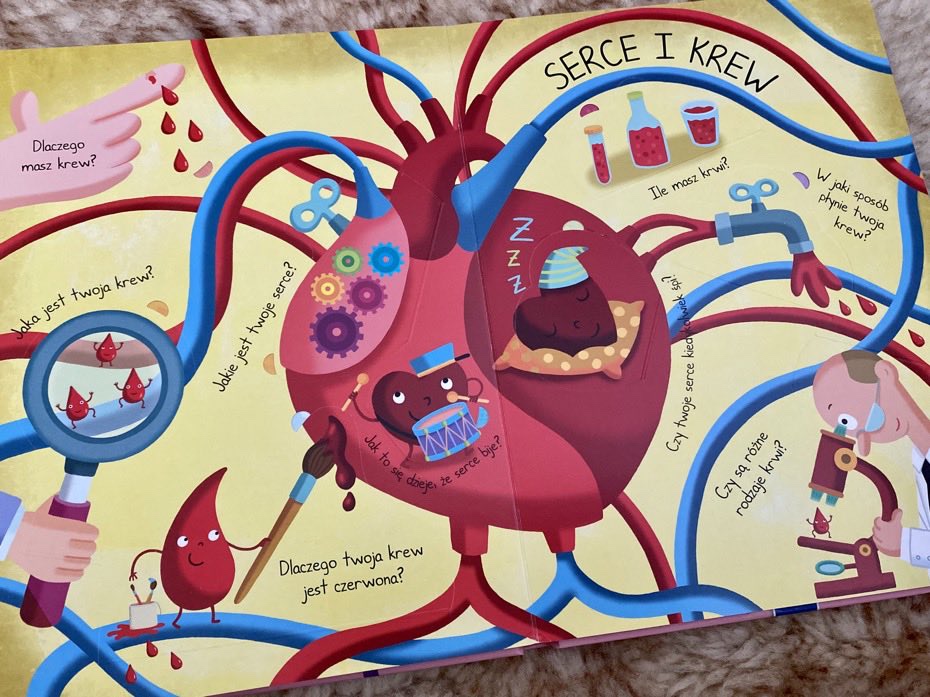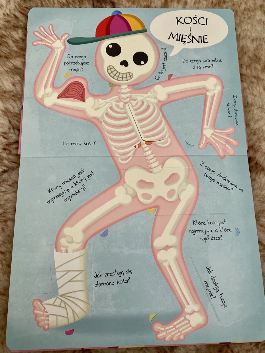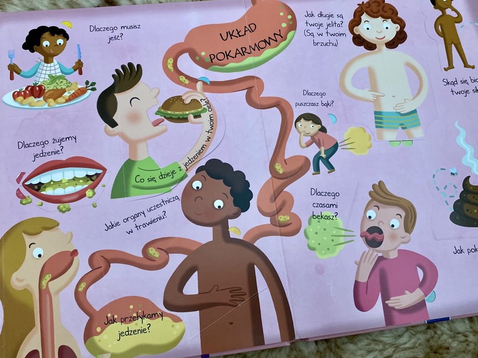 Lektura pozwala dziecku poznać tajniki ludzkiego ciała. Maluch dowie się, co dzieje się z jedzeniem i piciem, które idzie do naszych ust. Z czego zbudowane są mięśnie, jak zrasta się złamanie, dlaczego krew jest czerwona, jak wygląda mózg, po co nam paznokcie i wiele innych.
