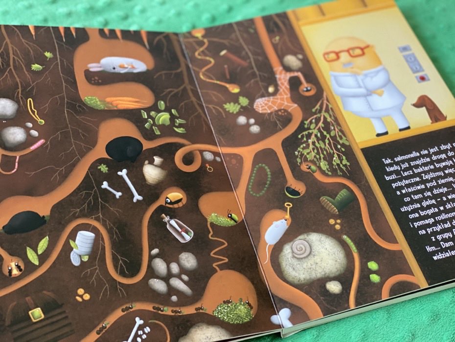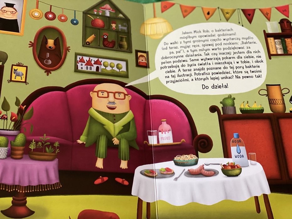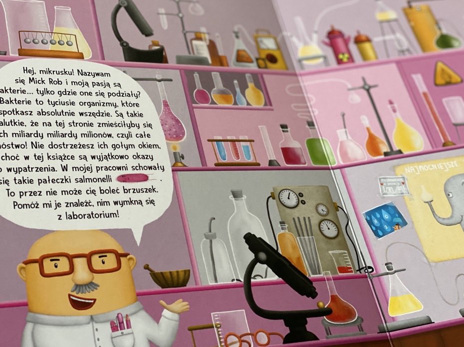 „Bakterie są wszędzie… ale czy potrafisz je znaleźć?” to książkowa wyszukiwanka dla najmłodszych, w której trzeba znaleźć pochowanych intruzów.