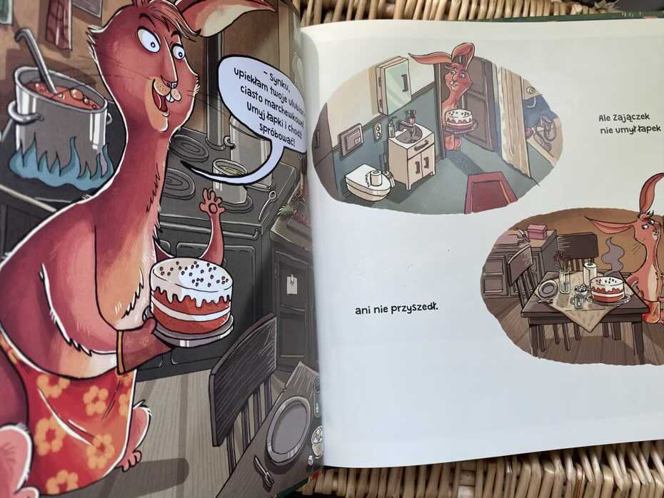 Mama Zajączka upiekła pyszne ciasto marchewkowe. Kiedy było już gotowe, do szczęścia brakowało kogoś, kto by się szybko nim zajadał.