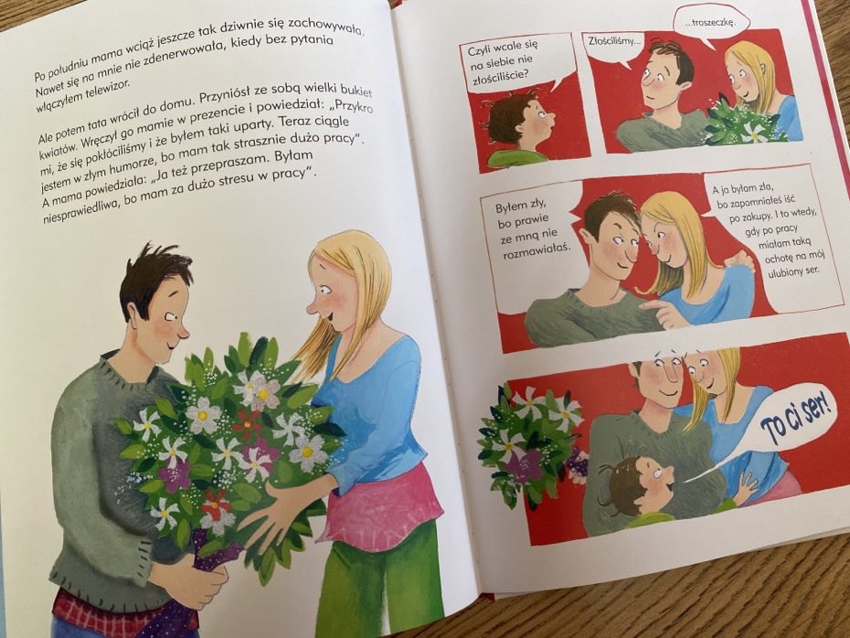 Kiedy tata wrócił do domu, przyniósł ze sobą wielki bukiet kwiatów. Wręczył go mamie i przeprosił. Zresztą mama także przeprosiła tatę. Po chwili cała kłótnia i złość były zapomniane.