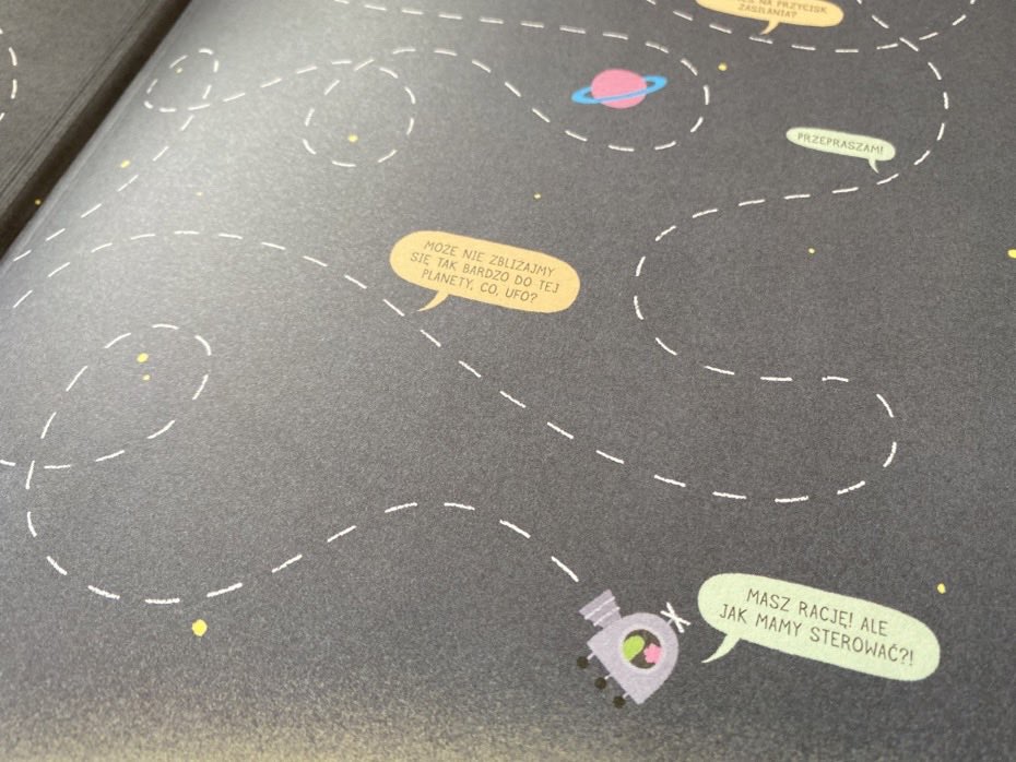 Od tego momentu dziecko bierze udział w interaktywnej zabawie. Z pomocą czytelnika kosmicie udaje się wyhodować ramiona. Niestety są za giętkie, aby mogły przepchnąć stojący niedaleko silnik, więc Aliena prosi czytelnika, aby położył dłoń na kartce, po to, żeby ludek mógł zaglądnąć do jego środka.