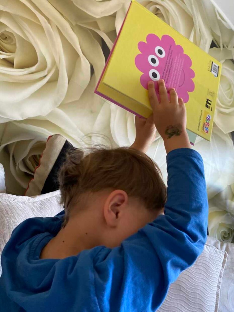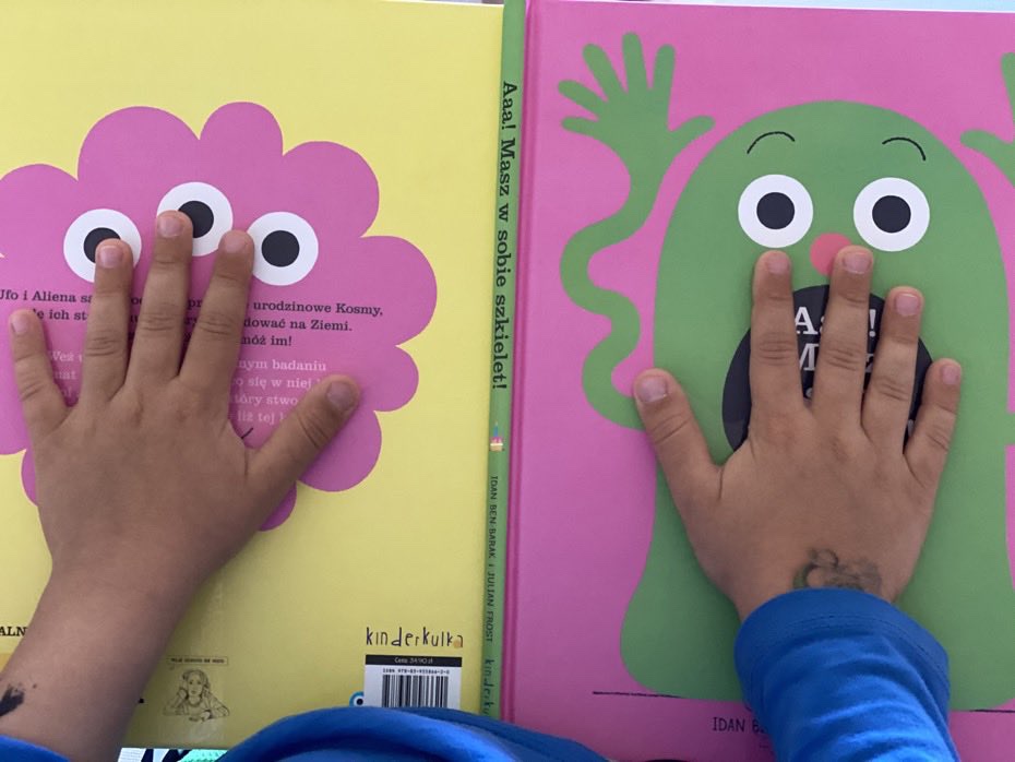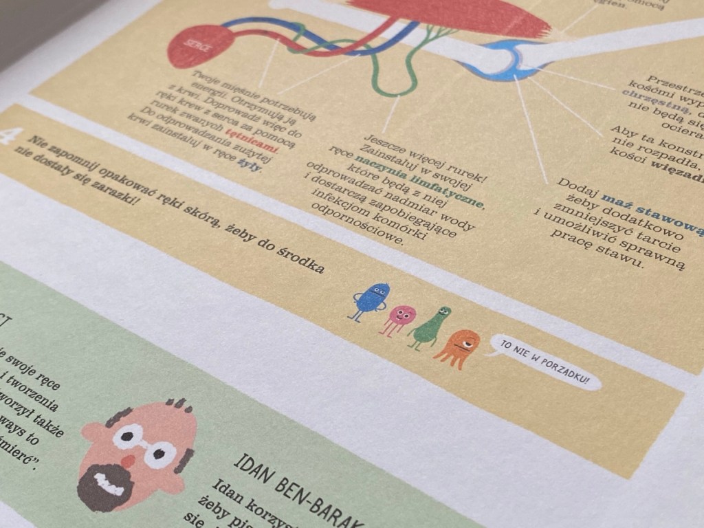 Na końcu mali czytelnicy znajdą bonusową rozkładówkę, z której dowiedzą się jak wyhodować ręce. Natomiast bystre oko Adasia zauważyło znanych i sympatycznych bohaterów z “Nie liż tej książki!”, o których możecie przeczytać tutaj.