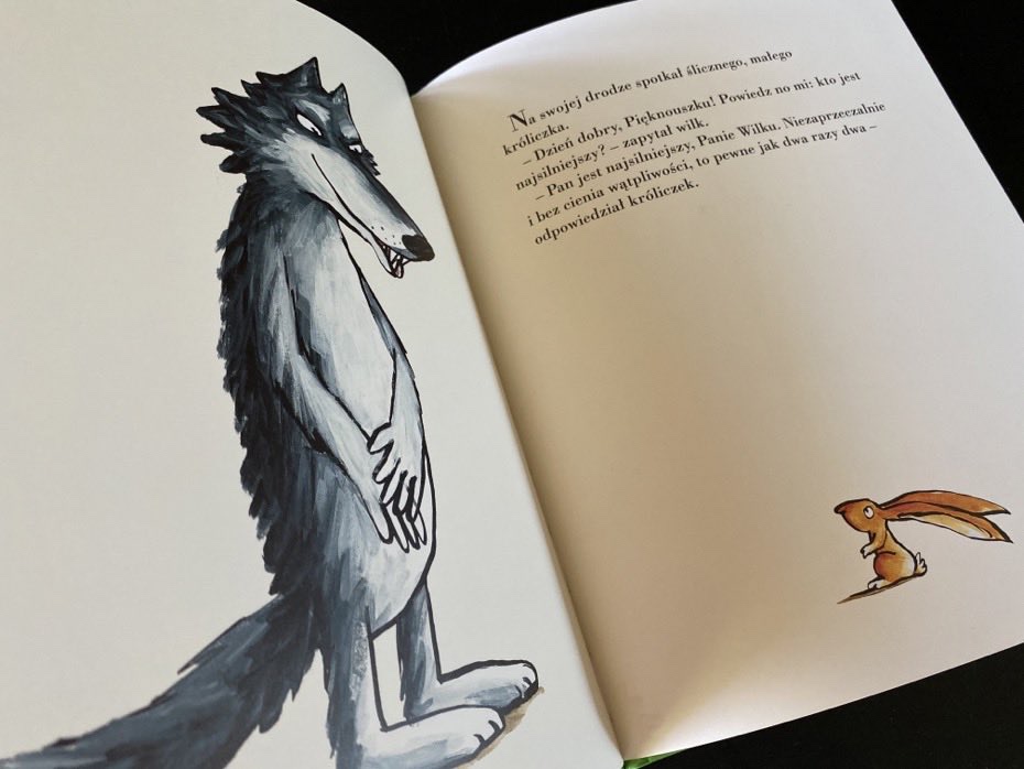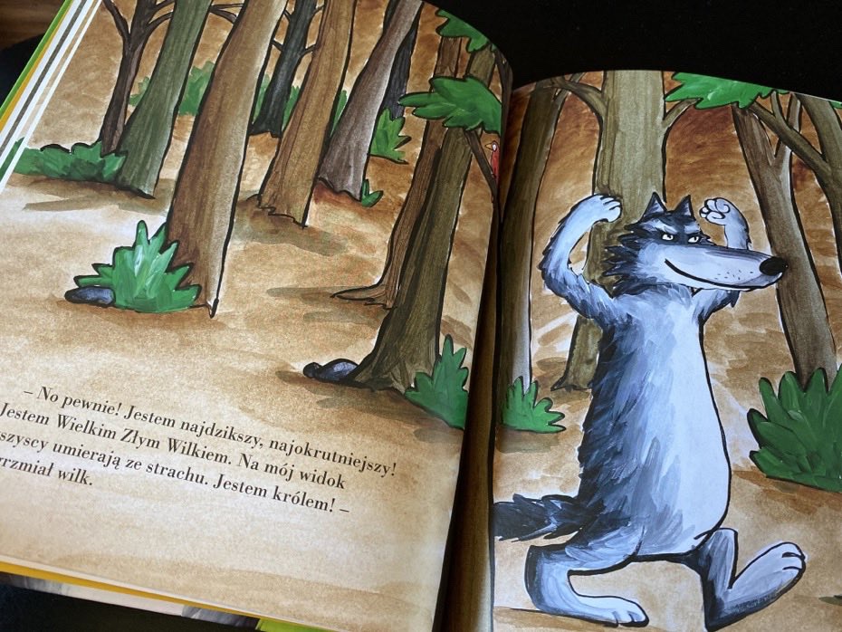 W końcu natrafia na malutką żabkę, która, ku rozczarowaniu wilka, odpowiada, że jego matka jest w rzeczywistości najsilniejsza w lesie. Wilkowi bardzo się to nie podoba i zaczyna się wściekać, dopóki nie widzi, kto pojawia się za żabką. Kogo zobaczy maczo-wilk przed oczami? Nie zdradzę… zapraszam do lektury.