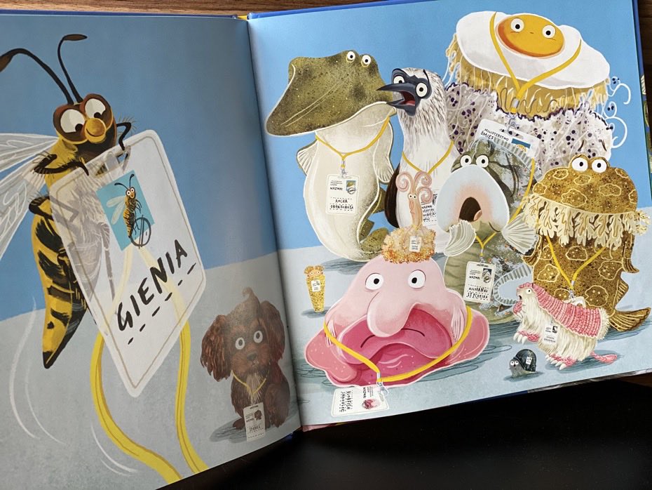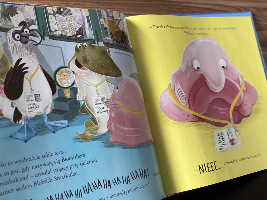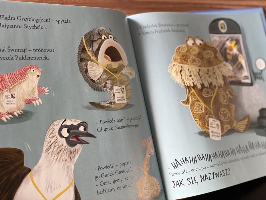 W dalszej kolejności poznajemy Głuptaka Niebieskonogiego, Robaka Waflaka, Rochę Łopatonosą, Blonfisha Smarkulca, Glutka Gnatojada, Flądrę Grzybiogębkę, Mintaja Świntaja, Frędzelja Brodatkę, Pobrzeżka, Jajeczniczkę Oceaniczkę i osę Aha Ha. Z tej ostatniej mieliśmy największy ubaw. Biedna osa pouczała zwierzęta z niemądrymi imionami, że nie nazywa się Hahaha, tylko Aha ha i dlatego chce zmienić imię na Gienia. Musicie sami to przeczytać i gwarantuję Wam, że będziecie się śmiać tak samo, jak zwierzęta z książeczki.