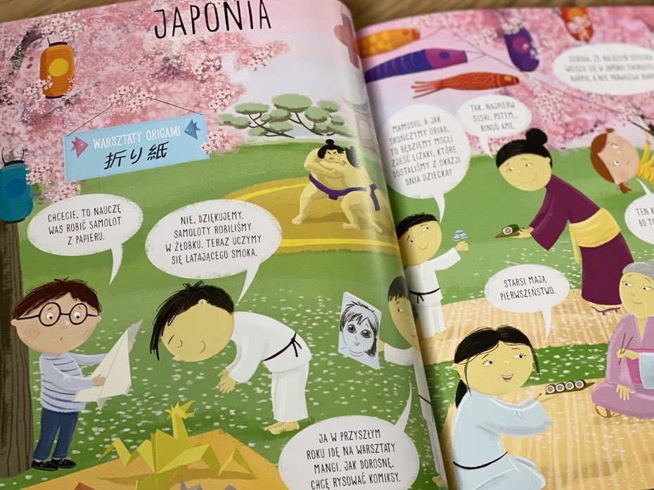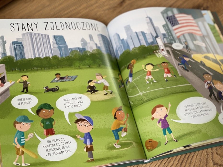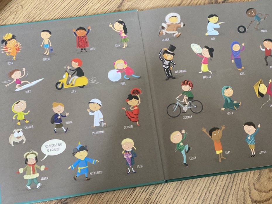 We wnętrzu okładki znajdziemy dzieci z różnych zakątków świata. Młody czytelnik pobawi się w detektywa i będzie musiał wskazać postać pasującą do odpowiedniego regionu Ziemi. Jest to świetna zabawa na spostrzegawczość, a do tego nauka na poszerzenie znajomości geograficznej i kulturowej.