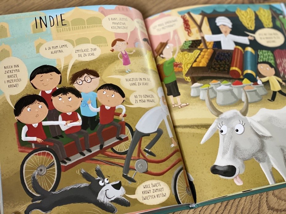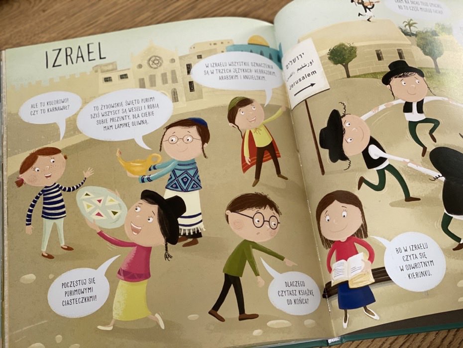 Tekstu na stronach książki jest stosunkowo niewiele, ale znajdziemy w nim istotne informacje. Dzięki temu możemy dowiedzieć się co nieco o przyrodzie, kulturze, strojach, językach i zwyczajach charakterystycznych dla różnych narodów. Dlaczego we Włoszech wiercimy palcem dziurę w policzku? Co Francuzi jedzą na śniadanie? Co Amerykańskie dzieci robią codziennie przed lekcjami w szkole? W którym kraju można zjeść cukierka krówkę, a w którym czyta się książkę od końca? Dlaczego w Indiach należy łapać się za ucho?