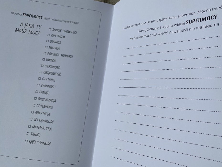 Na samym końcu książki znajdziemy listę, na której można zaznaczyć jedną lub więcej cech, które uważamy, że opisują naszego małego czytelnika. Dodatkowo autorka zachęca także do wymyślenia innych mocy, którymi możemy się opisywać, których nie ma na liście obok.