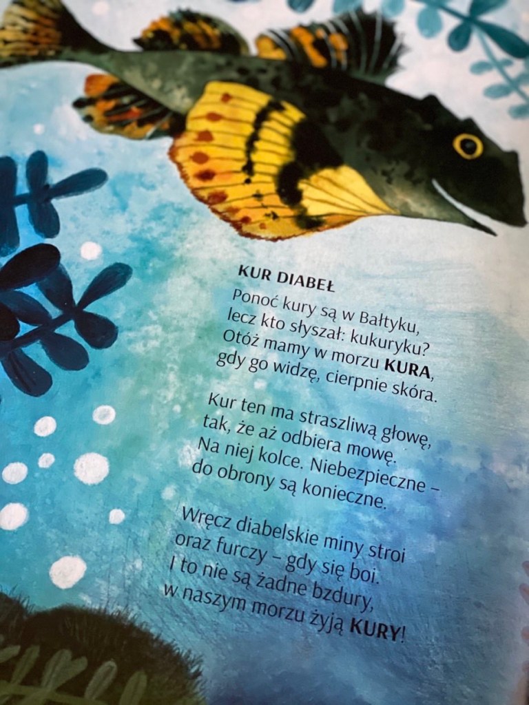 Dzieci zasięgną informacji na temat fauny Bałtyku i bliżej poznają, co w nim pływa. Poza Śledziem i Dorszem (najbardziej pospolitymi pływakami), najmłodsi dowiedzą się, że w naszym morzu gości dwumetrowy ssak, zwany Morświnem. Najmłodsi przeczytają, że Podwój Wielki to pożyteczny skorupiak, który oczyszcza wodę ze szczątków małych żyjątek. Natomiast tuż po zmroku, na plaży pojawia się Zmieraczek Plażowy, który sumiennie i żwawo oczyszcza nam plażę z glonów. Ciemną wodę zasiedla ryba Kur Diabeł, o fantazyjnych kształtach – jej straszliwa głowa pokryta jest kolcami i furczy, gdy się boi. Mamy nawet nieproszonego gościa, Kraba Wełnistoszczypca, który niszczy podwodną roślinność i sieci rybackie. Oczywiście w książce przedstawionych jest o wiele więcej zwierząt, mniej i bardziej znanych. Jeśli chcecie wiedzieć więcej, zapraszam do lektury.