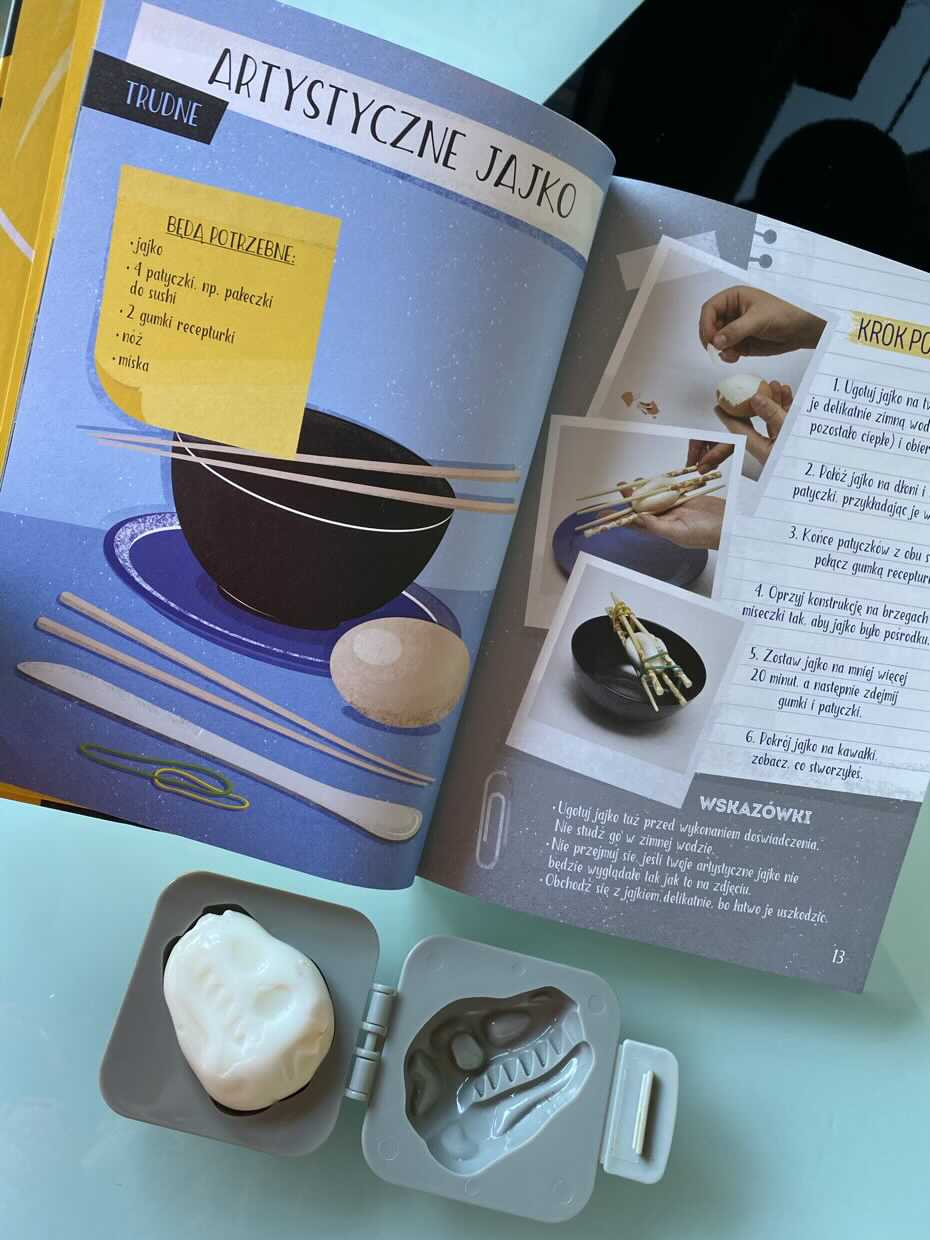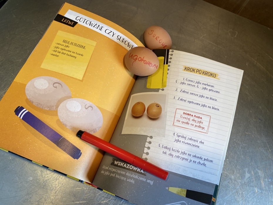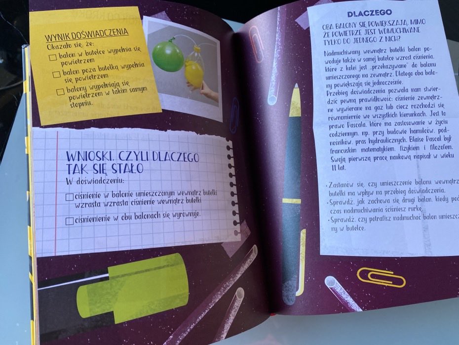 Z pewnością każdy znajdzie coś dla siebie. Mnie samą zainteresowało „jajko na miękko bez gotowania”, „megaodporny lód”, „100 szpilek w szklance wody”, „lód na smyczy”, „artystyczne jajko”, „balon na patyku”, „kwaśny czy zasadowy”, „elastyczny stworek”, „balonowe ciśnienie” i „gotowane czy surowe?”. Oto kilka zdjęć pokazujących nasze przeżycia.