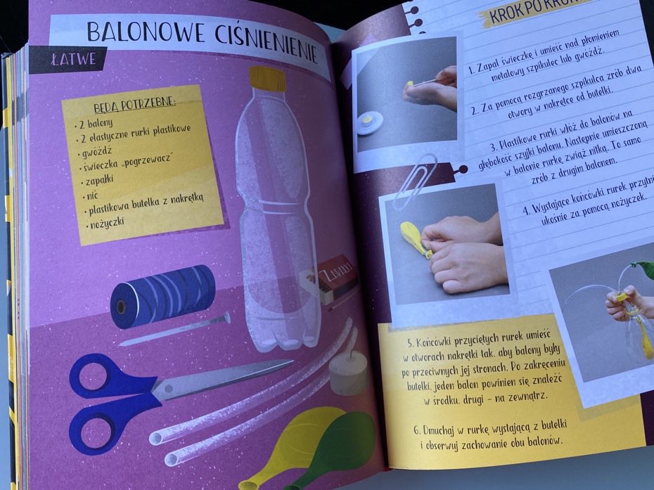 Większość użytych w doświadczeniach składników można znaleźć w domu albo kupić za niewielką kwotę w każdym sklepie. Fajne jest też to, że do tych eksperymentów nie trzeba się jakoś specjalnie przygotowywać, większość potrzebnych rzeczy znajduje się w każdym domu. Przestudiowałam całą książkę i wiem, że większość produktów się powtarza. Jajka, balony, barwniki, flamastry, plastikowe butelki, kubeczki, ocet i inne — to wszystko, co posiada każde domostwo.