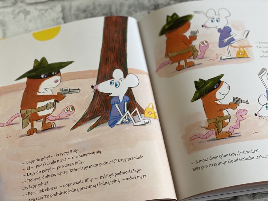 Billy robi co może, żeby nie zawieść ojca i pomimo pierwszego niepowodzenia, szuka kolejnej ofiary. Spotyka małą myszkę, która na jego komendę była zdezorientowana. Które łapy ma podnieść, przednie czy tylne? Zaraz po niej spotyka królika, który tak szybko pędził, że nawet nie zauważył Billiego i jego żądania. Jak widać, żadne ze zwierzątek nie bierze Billiego na poważnie, aż do czasu, kiedy staje przed nim ktoś, kto w końcu podnosi łapy do góry. Ciekawi Was ktoś to taki? Koniecznie przeczytajcie lekturę sami.