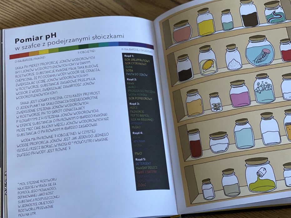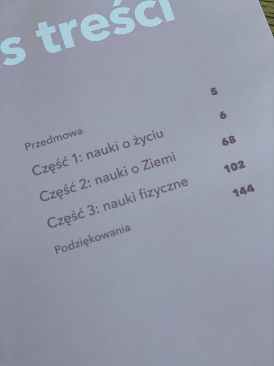 Dalej czytamy o nauce o Ziemi, czyli nauce przyrodniczej, której przedmiotem zainteresowania jest badanie fizyczne składu naszej planety oraz jej atmosfery. Dzieci zasięgną informacji o tym, czym jest fotosynteza, jakie kształty mają liście, czym charakteryzują się lodowce, jaskinie oraz góry. Poznają tajniki wędrówek kamieni, zajrzą do wnętrza martwego wieloryba i poznają ekosystem, który w nim powstaje. Dowiedzą się także, jak powstaje tsunami oraz jakie środki bezpieczeństwa trzeba zachować podczas jego trwania.