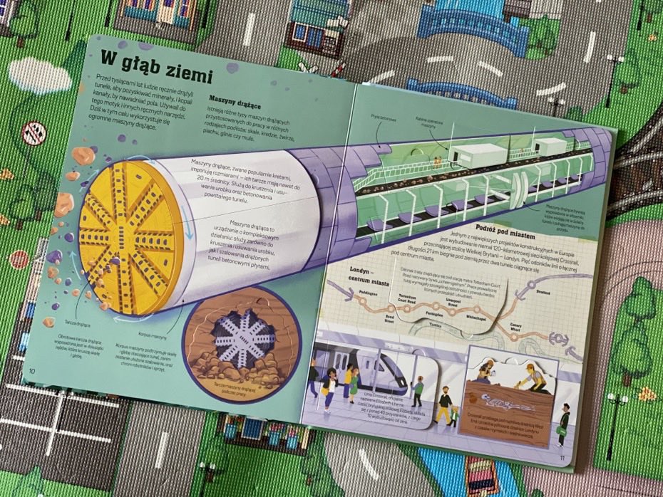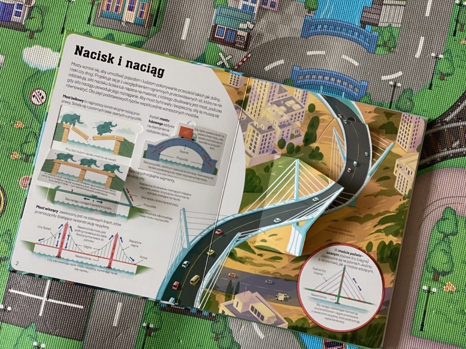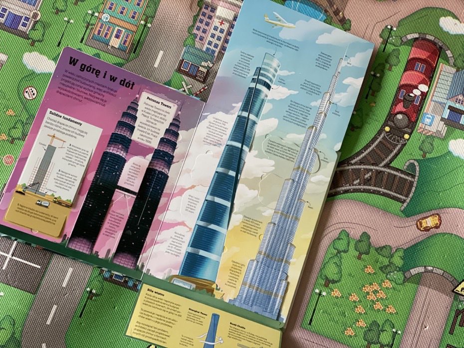 „Mosty, wieżowce, tunele. Książka z okienkami. Sprawdźcie sami…” ma piękne ilustracje wyjaśniające niektóre techniczne części inżynierii i opisuje szeroki wybór innowacyjnych projektów. Jest to źródło wartościowej wiedzy i fajnej zabawy. Według mnie to inspirująca książka, która może rozbudzić w dzieciach zainteresowanie inżynierią. Polecam.