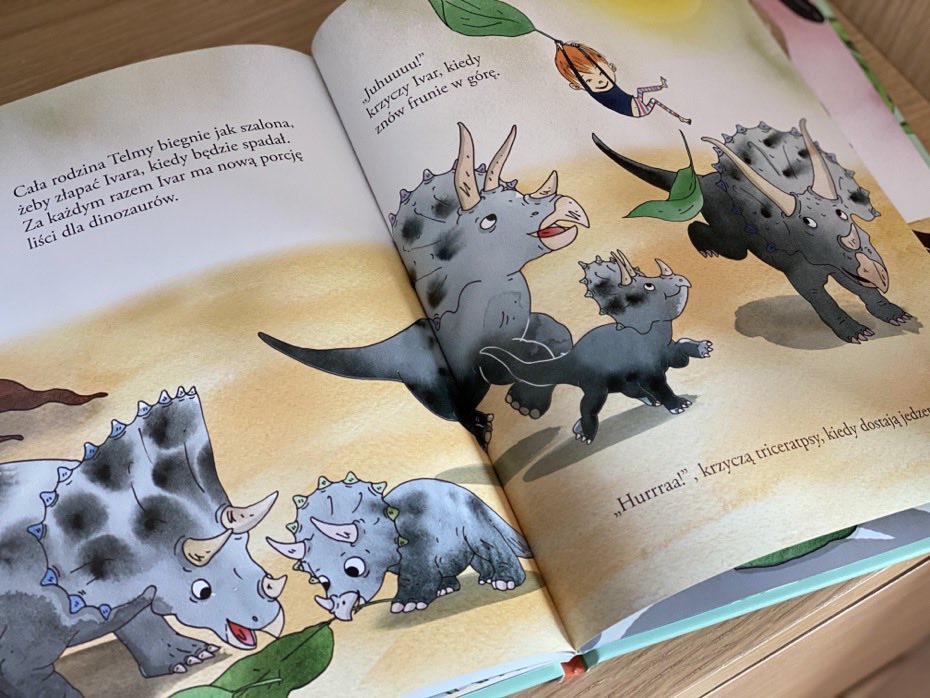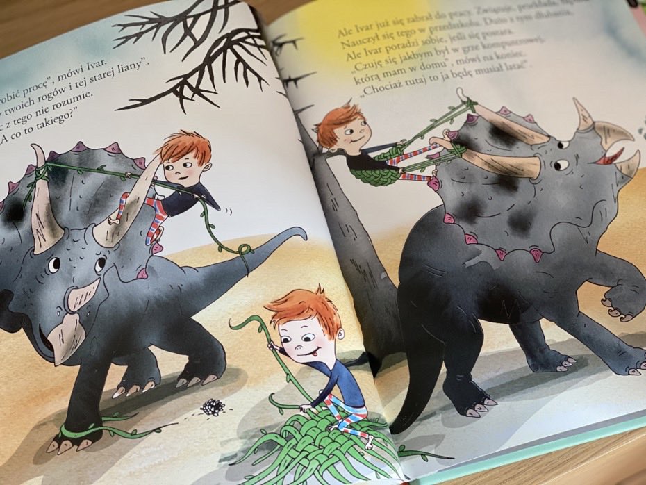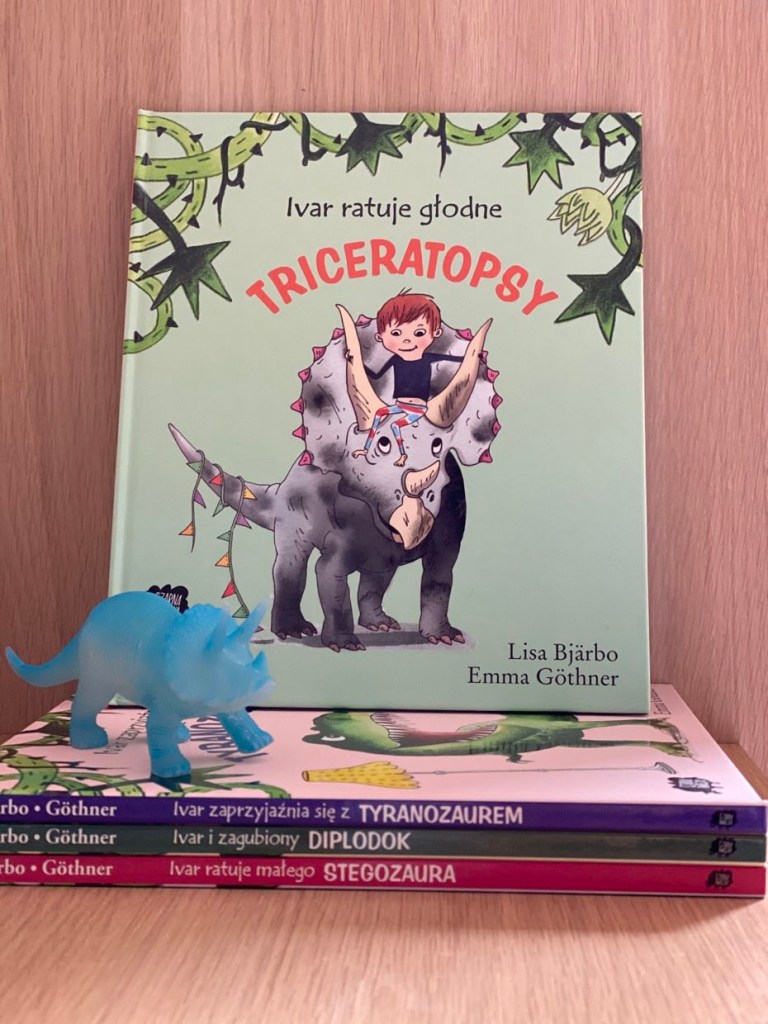 „Ivar ratuje głodne triceratopsy” to zabawna i pomysłowa pozycja o dinozaurach. Lektura pokazuje zwykłego chłopca z niezwykłymi pomysłami. Jak z prostego pudełka stworzył swój magiczny świat, w którym spędza wolny czas. Fantazja tego dziecka pobudzi naszą wyobraźnię. W tym wypadku Ivar staje się super bohaterem w świecie wyginiętych gadów. Po dzień dzisiejszy nasz mały wielbiciel dinozaurów wymyśla ciągle nowe historie i zabawy przy pomocy figurek. Polecam całą serię.