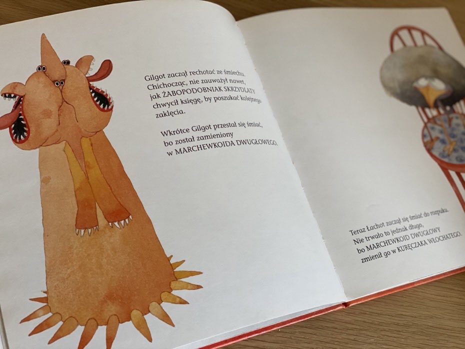 Łachot i Gilgot trzymali w łapkach starożytną księgę potworów w skórzanej okładce ze srebrnymi okuciami. Zawartość składała się z samych formułek i magicznych zaklęć. Potworki nie byłyby sobą, gdyby natychmiast nie zaczęły nawzajem zamieniać się w dziwne osobniki. Naprzemiennie stawały się zabawnymi postaciami.