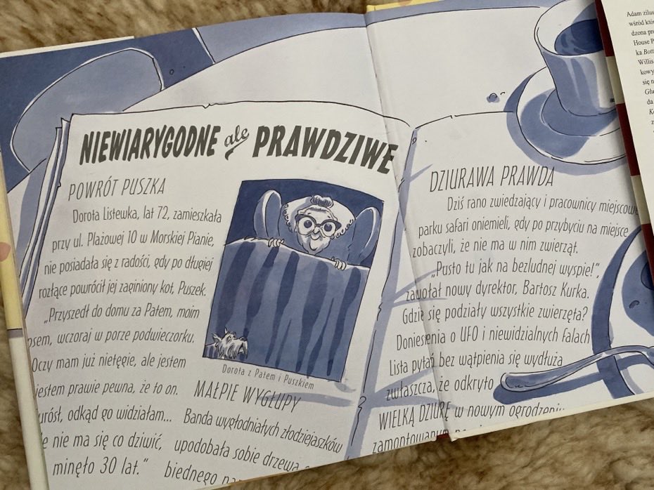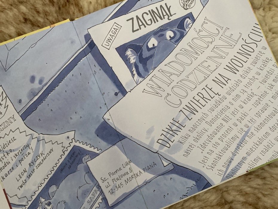 Już od wewnętrznej okładki dzieci widzą dwustronicowy rozkład reklam, poczty i wycinków z gazet, które informują nas / bohaterów o lokalnym sklepie zoologicznym i ucieczce dzikiego zwierzęcia w paski z zoo.