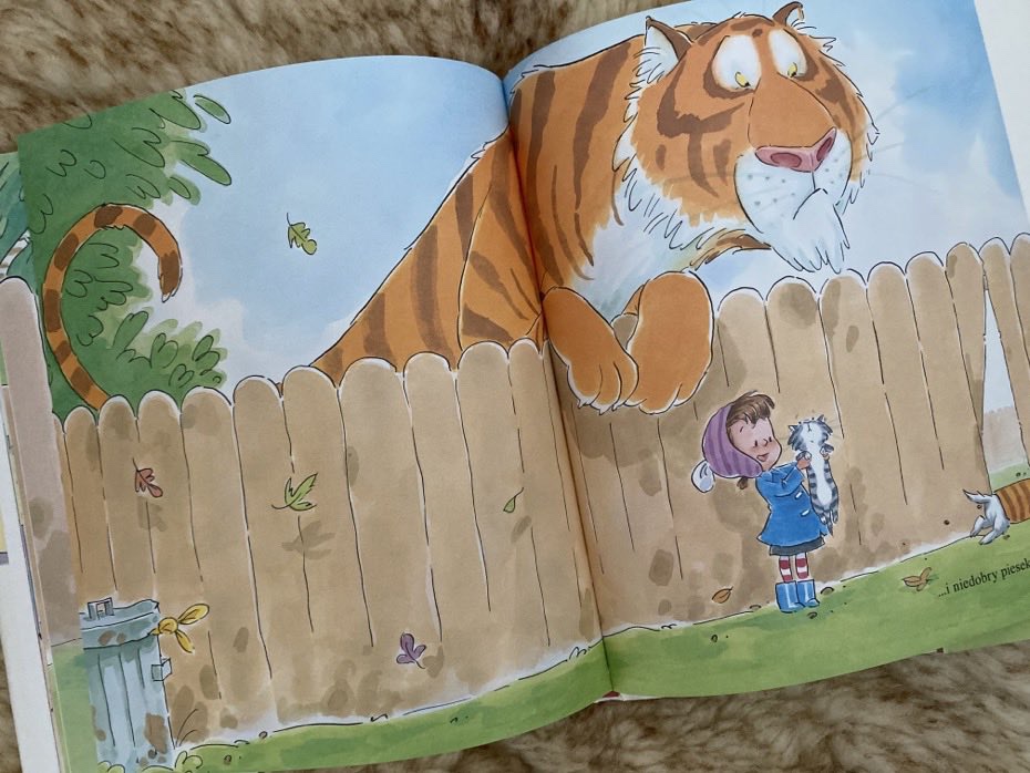 Historia zaczyna się od małej Lilki, która przyprowadza do domu swojego małego, szarego kotka. Dziewczyna bawi się z nim i karmi go. Gdy wychodzi z pokoju, tygrys, który uciekł z zoo, wchodzi i zjada osiem paluszków rybnych, wszystkie ciasteczka, śliwki w czekoladzie, słoik ogórków, różowy tort Mamy, golonkę Taty, oranżadę, 2 łyżeczki i gąbkę do mycia. Dziewczynka obwinia kotka za bałagan.