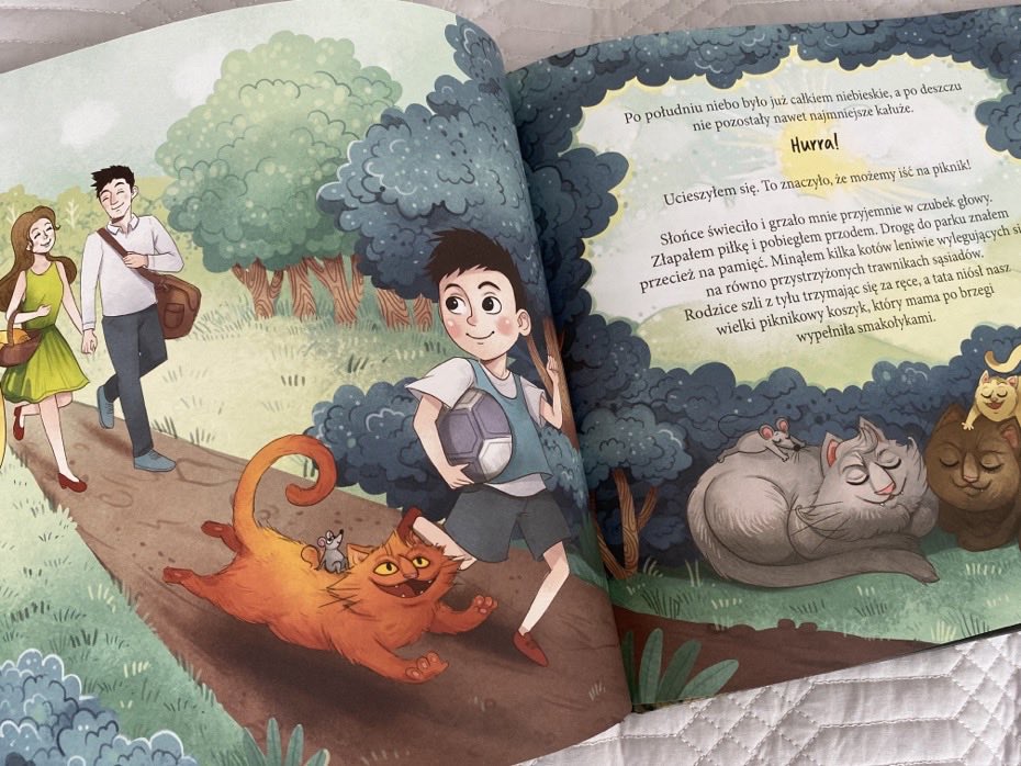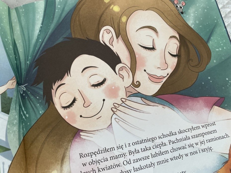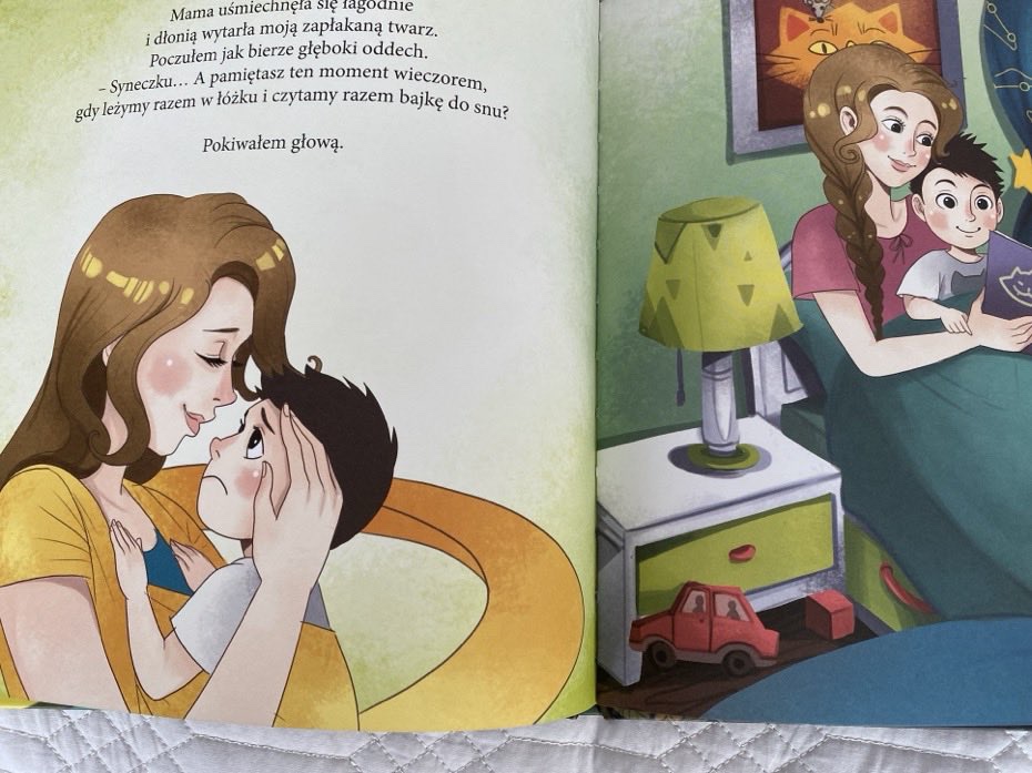 Fryderyka ogarnął smutek. Rozpłakał się, a wtedy mama zaczęła przywoływać wspólne radosne chwile, kiedy to leżeli razem w łóżku, czytając bajkę do snu, podczas kąpieli, jazdy na rowerze i zabawie na dywanie. Fryderyk zrozumiał doskonale, co mama chciała mu przekazać, dobry humor powrócił i wszystko było tak, jak być powinno.