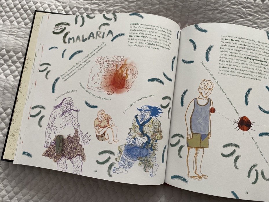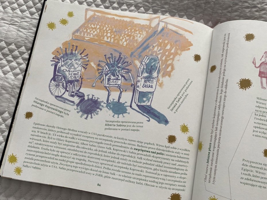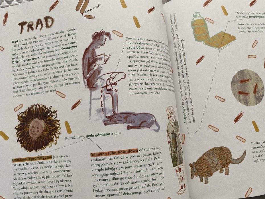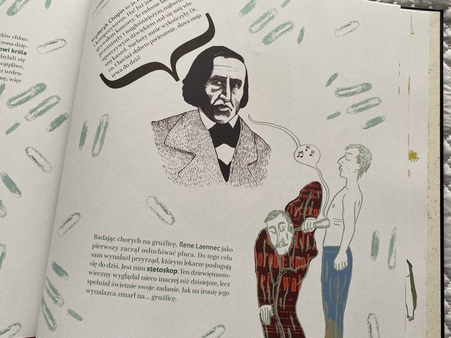 Młody czytelnik zasięgnie sporo informacji z zakresu biologii i medycyny, a także przeczyta mnóstwo ciekawostek dotyczących znanych ludzi, bohaterów literackich czy historii świata. Dziecko ma okazję z jednej strony poznać domowe sposoby, jakimi ludzie niegdyś próbowali walczyć z lękami, przesądami i chorobami, z drugiej zaś zasiąść w laboratorium obok dawnych medyków i spojrzeć przez mikroskop prosto w tajemnicę.