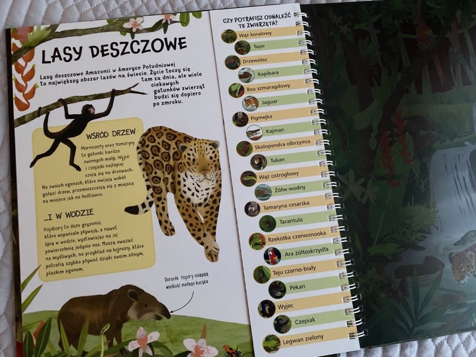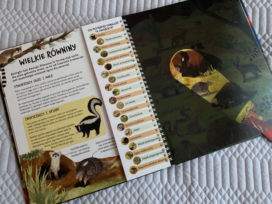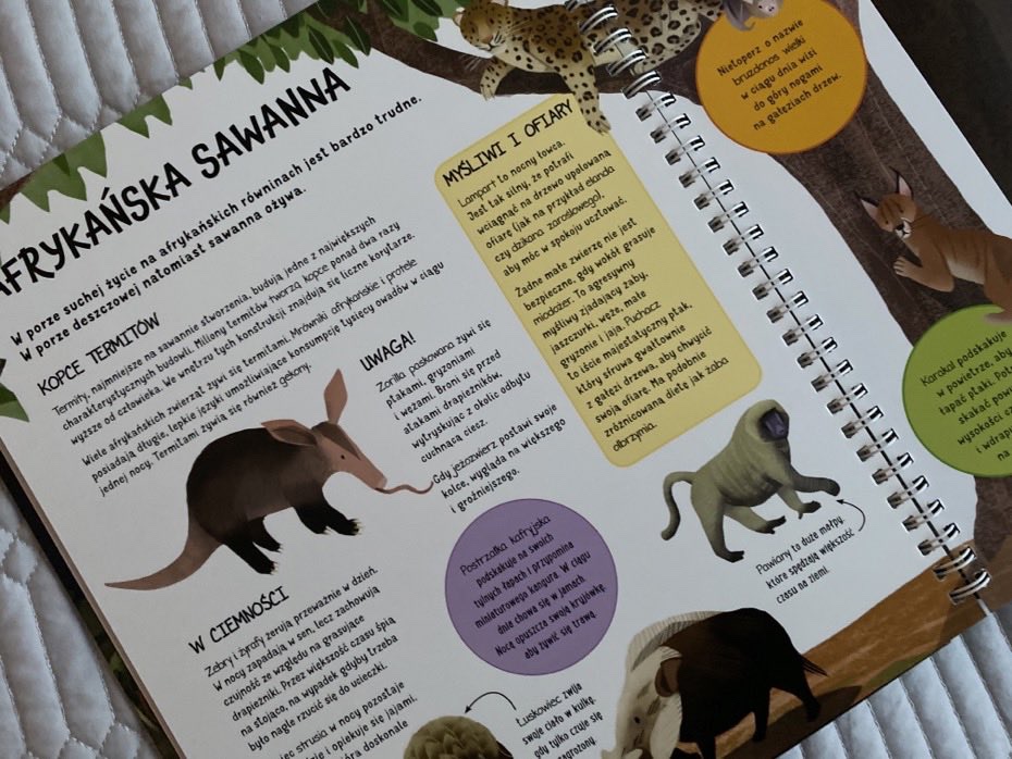 Dzika dżungla, afrykańska sawanna, skute lodem wybrzeże… Każda scena pokazuje inne środowisko. Na stronach znajdziemy krótkie opisy mieszkańców i sporo ciekawostek. Dzieci dowiedzą się o różnych siedliskach i niesamowitych zwierzętach, które mają tam swoje domy.