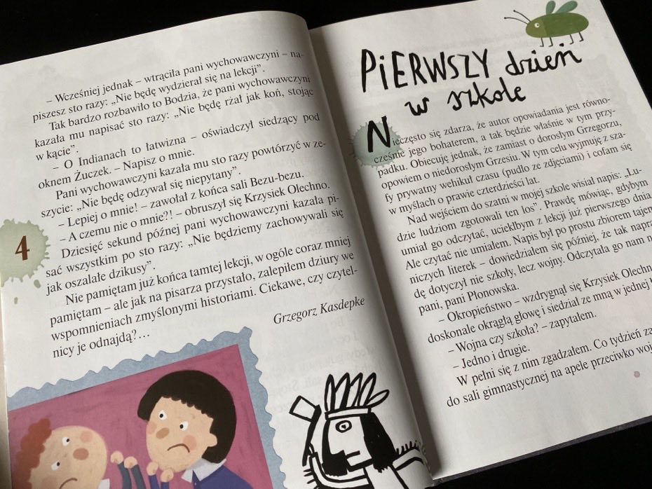 Młodzi czytelnicy przeczytają śmieszne historyjki – jak choćby, że chłopcy ćwiczyli taniec przed szkloną dyskoteką, dlaczego rozmawiało się z racuchami i naleśnikami, jak to się stało, że Krzysiek musiał nieść różowy tornister, co wspólnego ma oczko w pończosze z kaloriami, a także wiele innych zabawnych scenek.