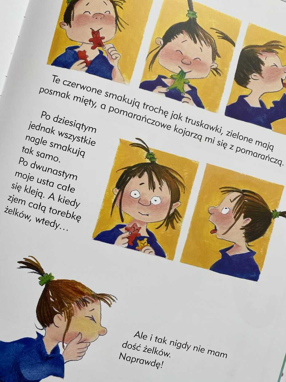 Na każdej rozkładówce młody czytelnik poznaje sytuację dziecka, które nie potrafi sobie odpuścić przyjemności. Luiza nigdy nie ma dość żelków, nawet w sytuacji, kiedy jest jej niedobrze od słodkiego, ciągle do nich wraca, ponieważ tak strasznie je lubi. Ewa uwielbia nurkowanie i doskonale wie, kiedy zabraknie jej powietrza pod wodą, ale nie poddaje się i ciągle próbuje dalej. Tomek kocha maskotki. Ma ich tak dużo, że czasem szuka swojej ulubionej z numerem 1. Emilka i Filip uwielbiają spędzać ze sobą czas. Nawet kiedy są bardzo zmęczeni, po wspólnym odpoczynku wracają dalej do następnej zabawy. Lilka lubi błyszczeć z daleka. Najchętniej nosiłaby wszystkie błyskotki na sobie przez cały czas. Paweł jest typem przytulaka, ale obejmuje tylko kogo chce. Kiedy pojawia się ciocia Amelia, udaje, że nim nie jest. Marysia jest telemaniaczką. Jej odbiornik telewizyjny jest ciągle włączony, przez co traci świetną zabawę z rówieśnikami na świeżym powietrzu. Norbert uwielbia jeść frytki z keczupem. Nigdy nie odmówi sobie porcji, nawet jeśli ma na stole smaczną porcję sałatki, brzuch wypełnia frytkami, aż nie pomieści ani jednego dodatkowego kęsa.