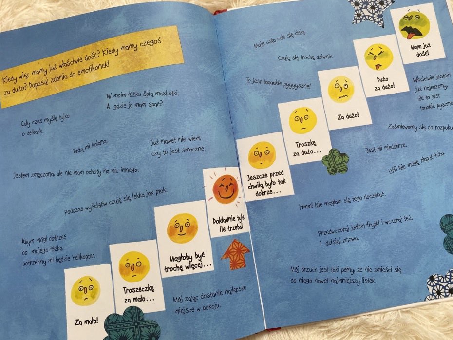 Na końcu książeczki dziecko może dopasować uśmiechnięte buźki do zdania, które dotyczyło wcześniejszych historyjek. W ten sposób można sprawdzić u dziecka jego reakcje na znaną mu już sytuację.