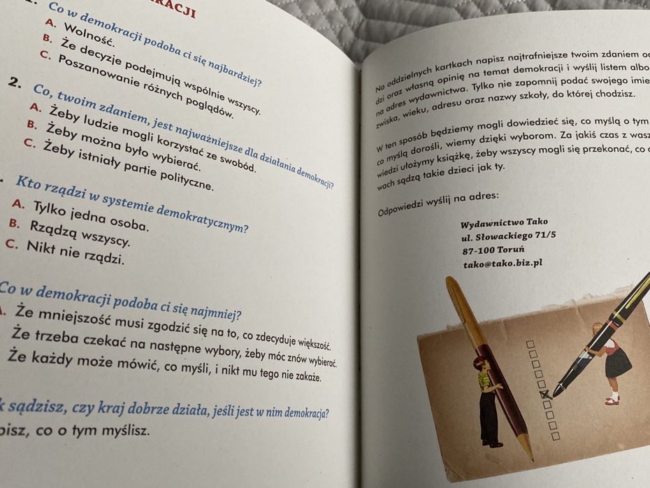 Książkę zamyka „test z demokracji” składający się z 5 pytań oraz zachęca młodych czytelników i czytelniczki do nadsyłania odpowiedzi do wydawnictwa, na podstawie których powstanie nowa książka. W ten sposób wszyscy będą mogli się dowiedzieć, co o tych sprawach myślą dzieci.