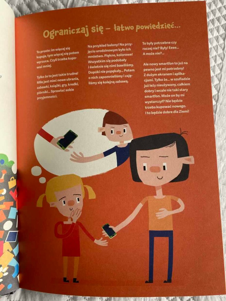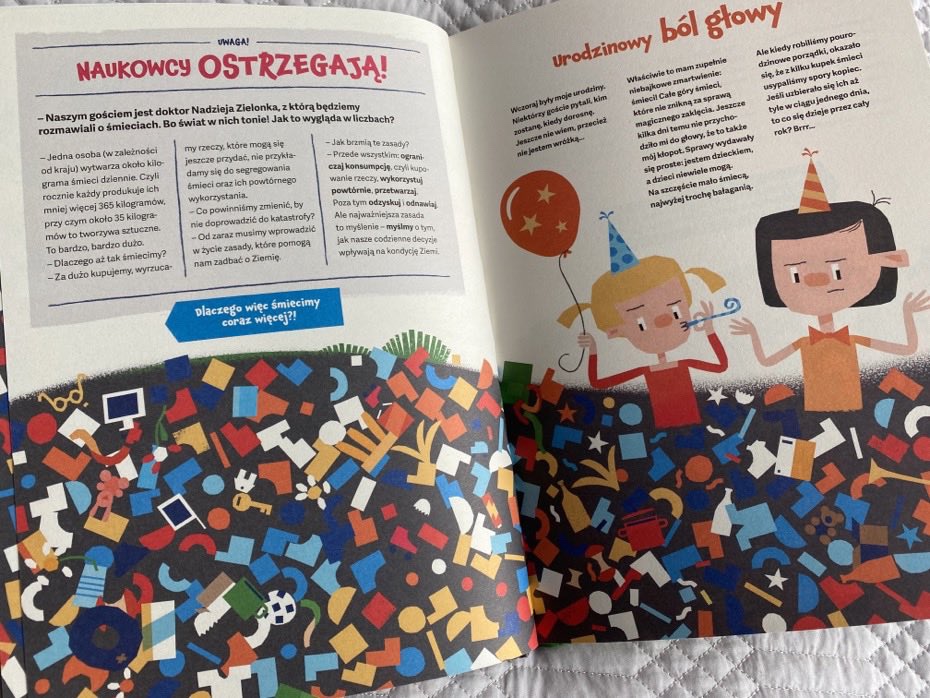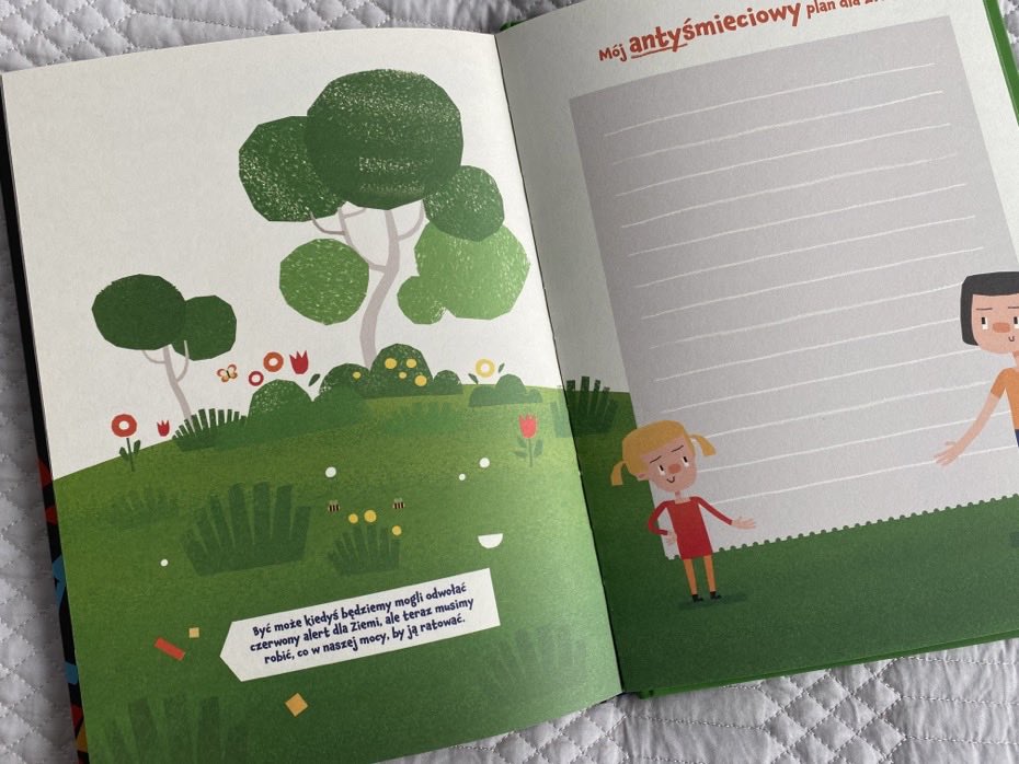 Na końcu książki znalazło się też miejsce na nasz własny, antyśmieciowy plan dla Ziemi. Ciekawym zabiegiem jest także przeglądanie książki od tyłu, zgodnie z instrukcjami umieszczonymi na strzałkach, które ukazują jaką górą śmieci zasypujemy każdego dnia naszą Planetę. W oczach czytelników ukazuje się zanieczyszcza, zniewolona Ziemia, pod grubą skorupą odpadów.