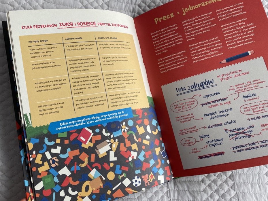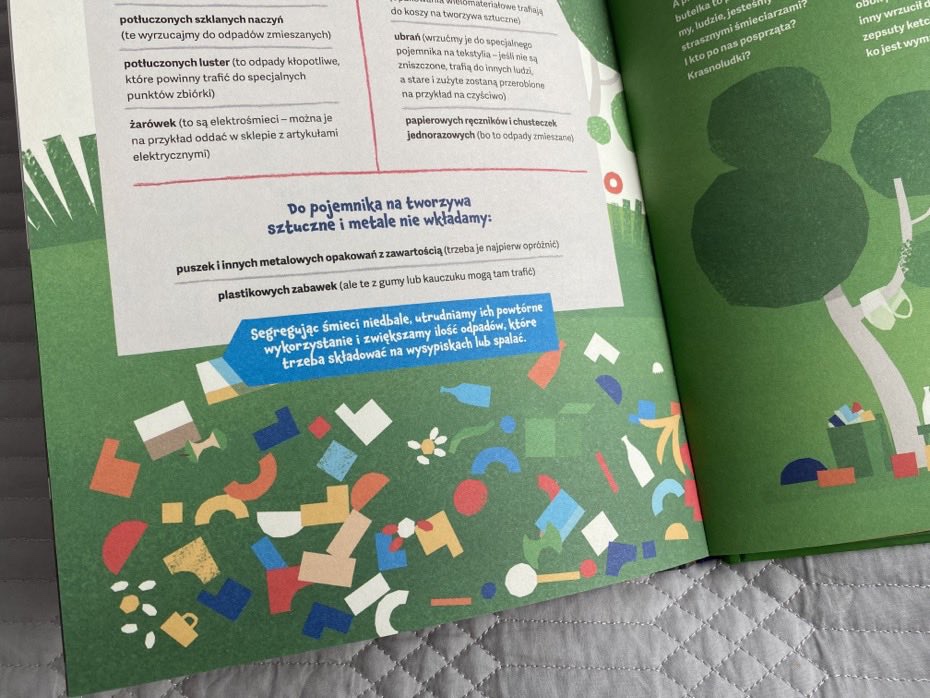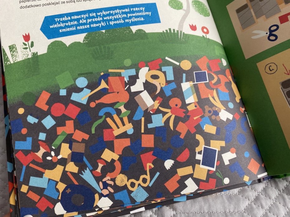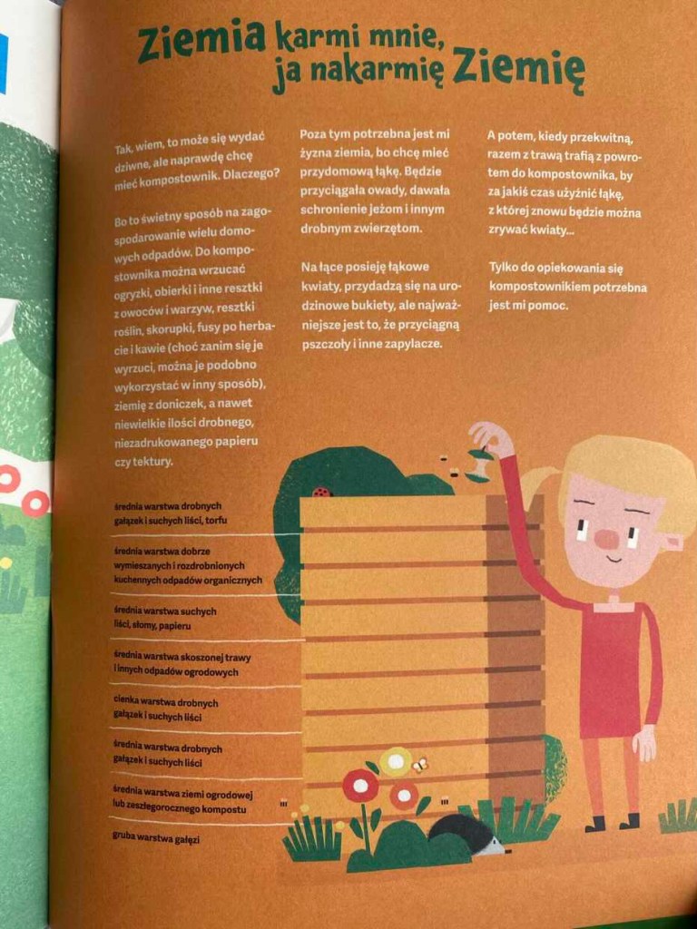 Książka wypełniona jest ciekawostkami i przydatnymi poradami. Prosto wyjaśniona budowa kompostownika pokazuje, jak w kreatywny sposób można wykorzystać rzeczy, które nadają się już tylko do wyrzucenia. Fajne jest też to, że dzieci można zainspirować do tworzenia przeróżnych zabawek i przydatnych w domu rzeczy – zupełnie bez dodatkowych kosztów oraz z tego, co każdy z nas ma w domu.