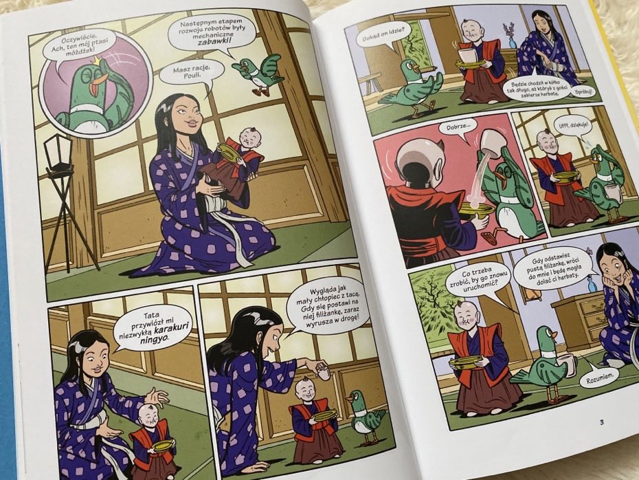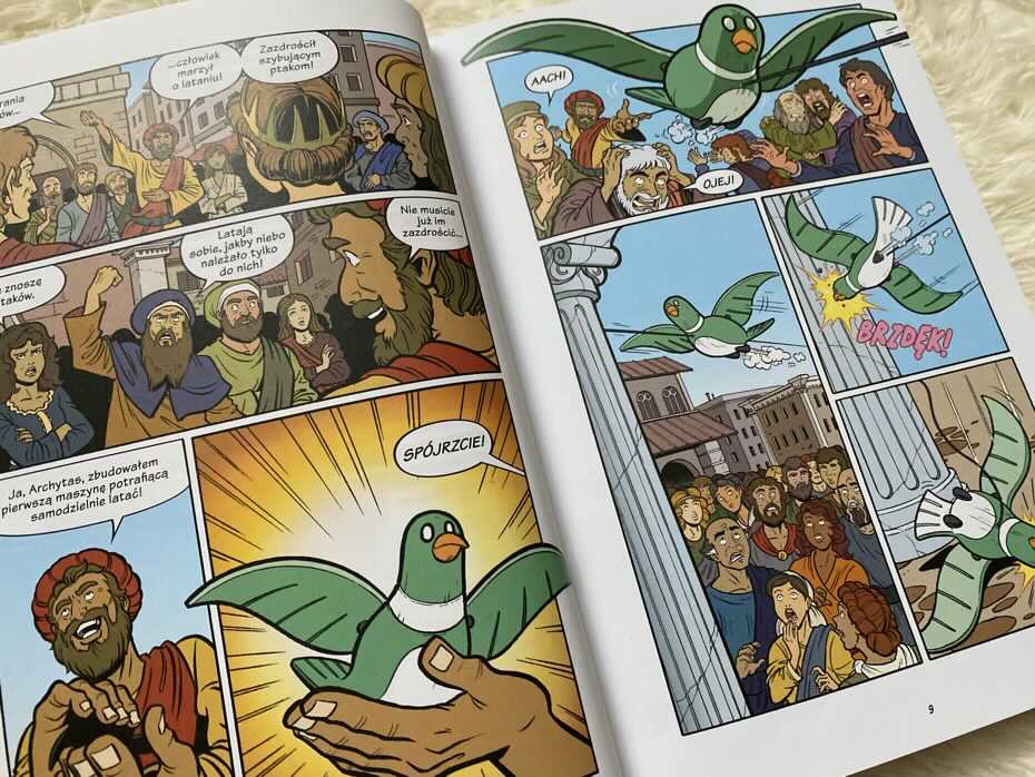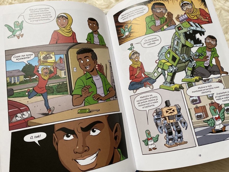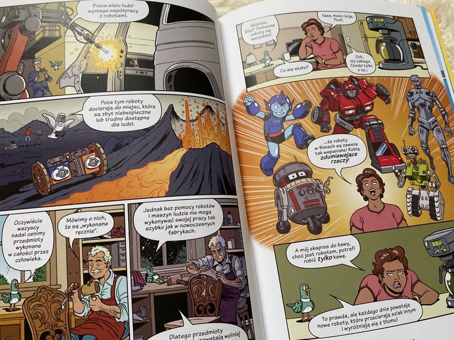 „Roboty i drony – dawno temu, teraz i w przyszłości” to wartościowy komiks, którego głównym zadaniem jest przekazanie dzieciom wiedzy o robotyce. Dzięki kolorowym ilustracjom i opowiedzianej przez mechanicznego ptaka historii wszystkie ciekawostki są bardziej przystępne dla młodszych czytelników. Według mnie lektura pochłonie szczególnie ciekawskich, wychodzących naprzeciw nauce. Bardzo polecam.