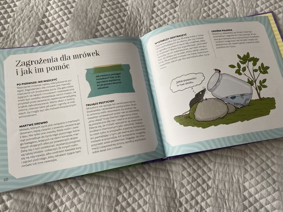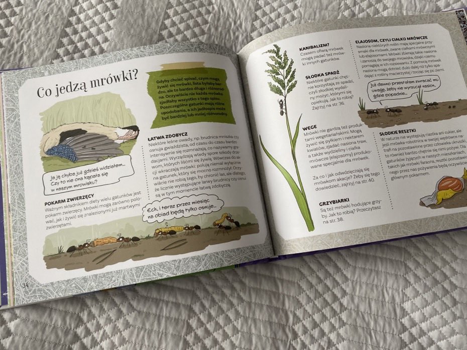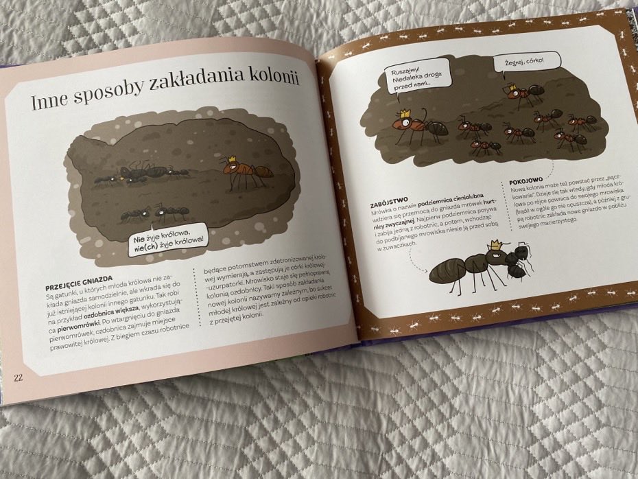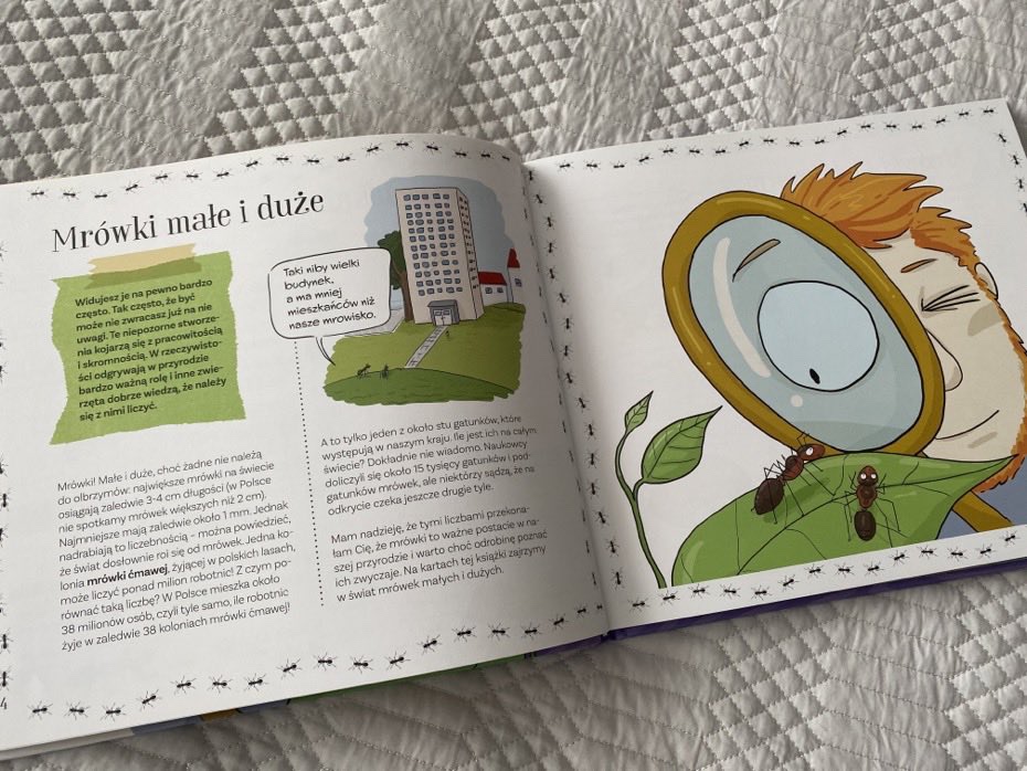 Młodzi czytelnicy poznają schemat przeobrażenia się mrówki z jajka do dorosłego osobnika. Zapoznają się z nazwami takimi jak: trofalaksja i formikarium. Dzieci dowiedzą się, jak wygląda typowe mrowisko oraz gdzie mieszkają polskie gatunki mrówek. Przeczytają, czym się żywią, kto stanowi dla nich zagrożenie i jakie znaczenie spełniają w przyrodzie. Nie zabraknie informacji o niebezpieczeństwie dla mrówek. Jedną z ciekawostek jest to, że niejaka Pogonomyrmex Salinus przeżyła na wolności 30 lat i jest to udokumentowane, a jej koleżanka (królowa hutnicy zwyczajnej) w warunkach hodowlanych żyła ponad 28 lat.