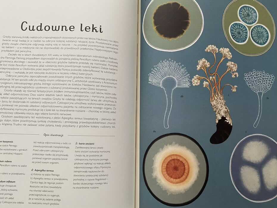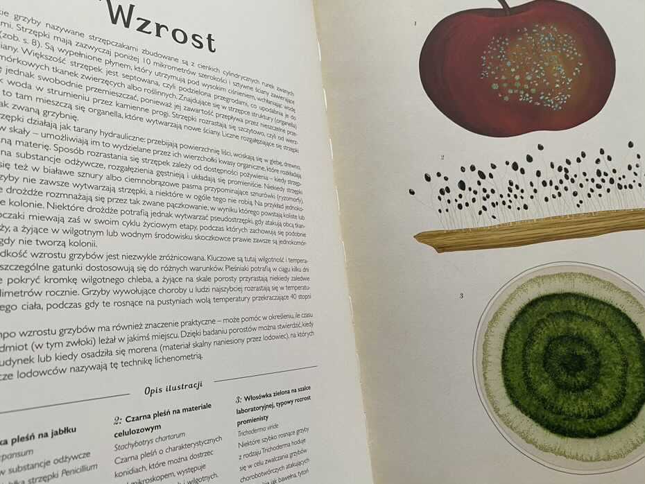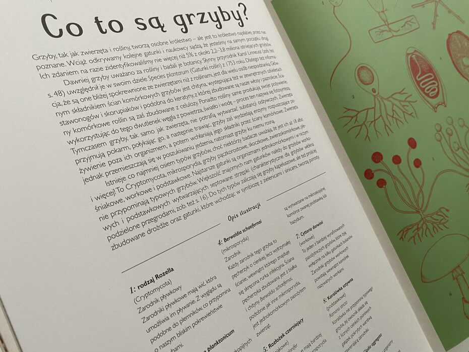 Książka przedstawia miejsce występowania grzybów w przyrodzie, sposób ich wzrostu, miejsca występowania oraz różne rodzaje. Według mnie terminologia jest często zbyt techniczna, co może przytłaczać małego czytelnika. Na plusie są towarzyszące ilustracje botaniczne pozwalające na wizualne badanie grzybów, a także na przyswajanie słów.
