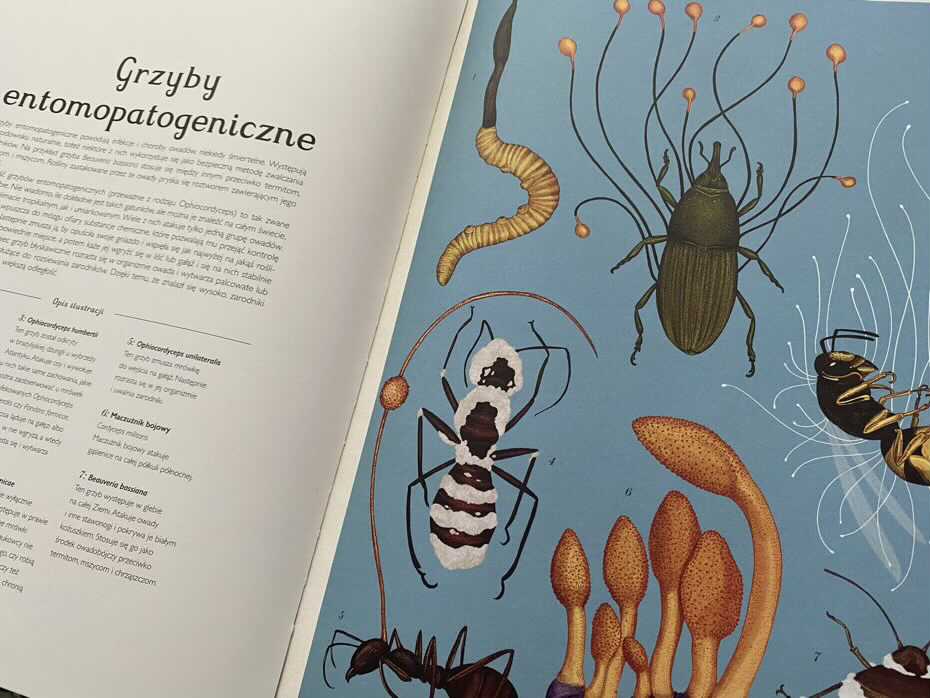 Najbardziej fascynującym momentem w lekturze okazał się temat poświęcony grzybom zombie. Ku mojemu zaskoczeniu Adaś wiedział o nich sporo, jeszcze zanim zdążyłam doczytać do końca. A to dzięki jego ulubionemu kanałowi przyrodniczemu „Atlas” na YouTube (link na końcu). Na świecie jest 90 gatunków tego grzyba. Najpopularniejszy, maczużnik chiński, jest stosowany w medycynie tradycyjnej, głównie na Tybecie i w Chinach. Grzyb zombie jest w stanie przejąć kontrolę nad ciałem mrówki, dosłownie zmieniając ją w zombie. Po zarażeniu owada atakuje on jego system nerwowy i praktycznie przejmuje kontrolę nad ruchami ofiary. Dla mnie jest to szokujące i przerażające, ale nie zniechęciło to naszego dziecka do dalszego studiowania książki.
