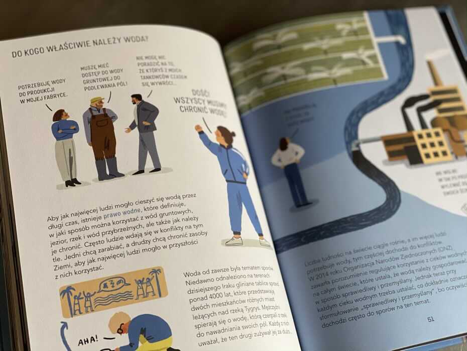 Z książki młodzi czytelnicy dowiedzą się o pochodzeniu Ziemi, zmianach klimatycznych, globalnym ociepleniu, efekcie cieplarnianym i ochronie środowiska. W dalszej części przeczytają o pogodzie (powodziach i suszy), obiegu wody, wodzie pitnej, zużyciu i jej niedoborze. Młodzi odbiorcy przyjrzą się wodociągom, usłyszą o prawach do wody i poszerzą wiedzę o klimacie. Dzieci poznają też różne zawody związane z wodą, a także jak ta substancja przyczynia się do produkcji energii.