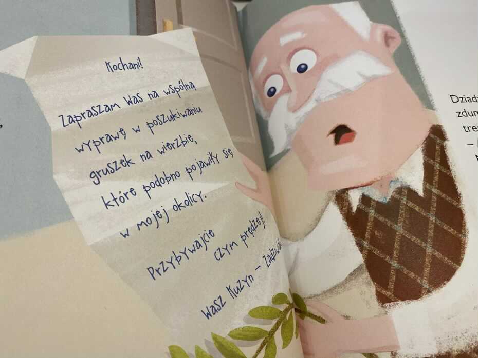 Dzieci pełne zachwytu, nie mogły doczekać się przygody i wkrótce wyruszyły z dziadkiem za miasto. Na miejscu maluchy co chwilę dziwiły się na widok pięknych robaczków, ptaszków i zwierzątek. Po kilku godzinach znalazły ogromną wierzbę, z której zwisały gruszki. Okazało się, że kuzyn Zadziwiaka pozawieszał owoce na cienkiej nici.