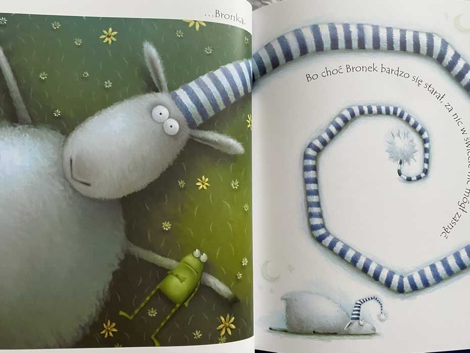 Pewnej nocy w Żabim Mokradełku baranek Bronek miał problemy z zaśnięciem. Przeraża go ciemność na cichej łące i jest mu za gorąco w jego własnej wełnianej skórze. Ćwiczenia, poduszka, czy zmiana lokalizacji nie pomagają.