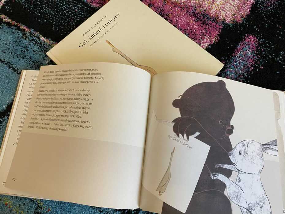 „Baśń o zaczytanym Niedźwiedziu i o Króliku, który spadł z nieba” to niezwykła, nostalgiczna opowieść trzymająca w napięciu, mówiąca o potrzebie przyjaźni, dzielenia się pasją i wspaniałym darze, jakim jest umiejętność czytania. Jest to uczta dla każdego zaczytanego dziecka i rodzica, którzy mogą odnaleźć masę książkowych odniesień do literatury dla najmłodszych. W lekturze znajdziemy kilka znanych tytułów m.in. „Miejsce na miotle”, „Przygody Sindbada Żeglarza”, czy „Gęś, śmierć i tulipan”. Według mnie jest to jedna z pozycji, będących małymi dziełami sztuki, w których słowo idealnie współgra z obrazem, a ponadczasowe przesłanie ma szansę zostać z czytelnikiem na zawsze. Szczerze polecam.