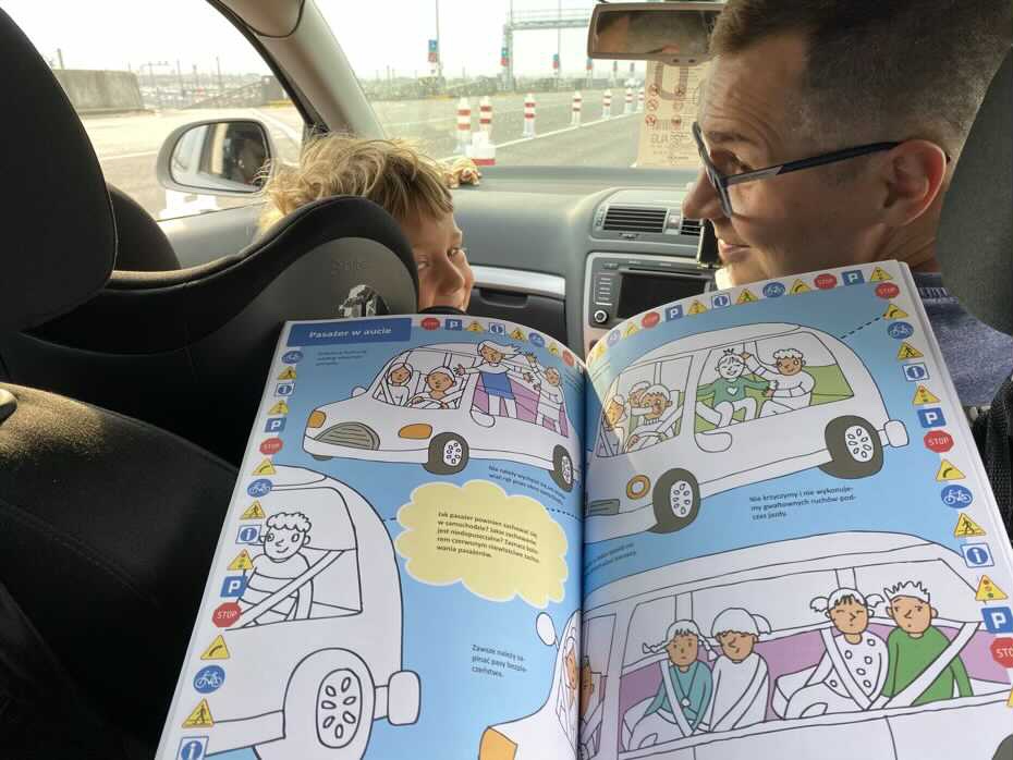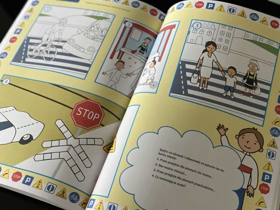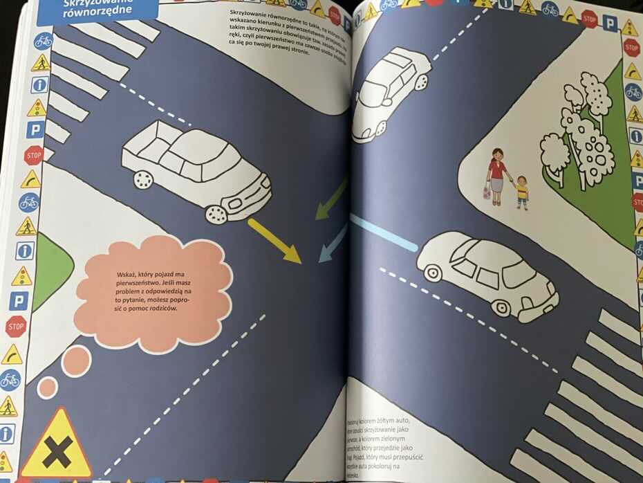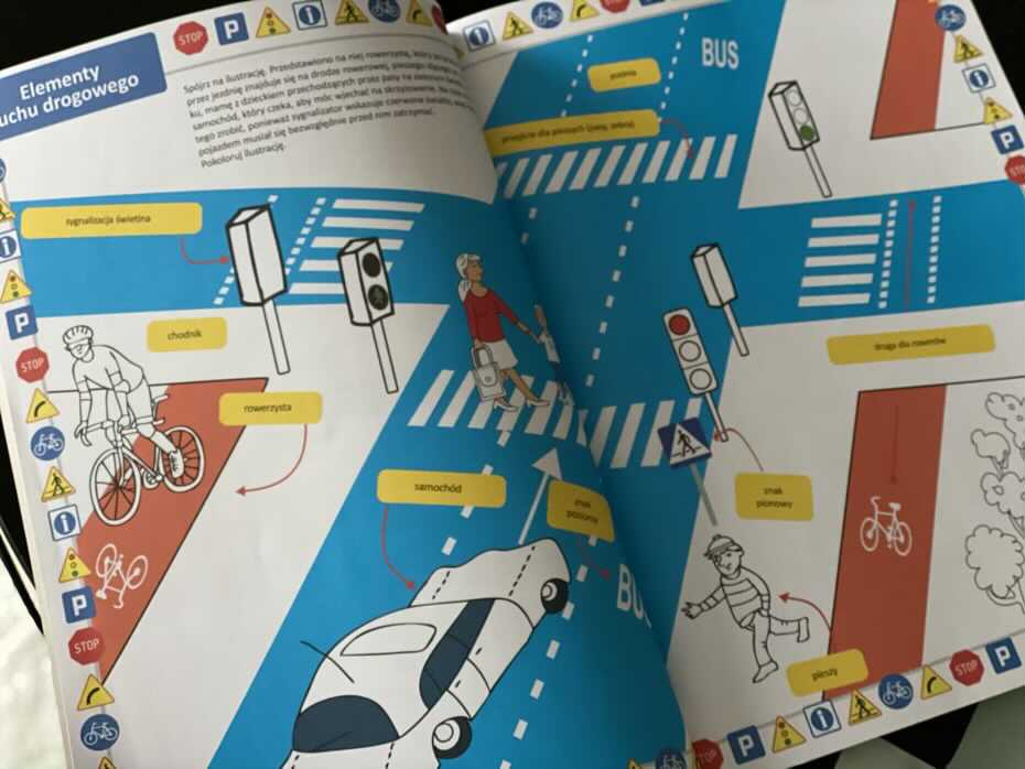 Książeczka zawiera sporą wiedzę dostosowaną do potrzeb małego uczestnika ruchu drogowego. W środku znajdziemy kwestie związane z bezpiecznym poruszaniem się po drogach, znaki drogowe, ważne telefony alarmowe, zawartość apteczki samochodowej i wiele innych.