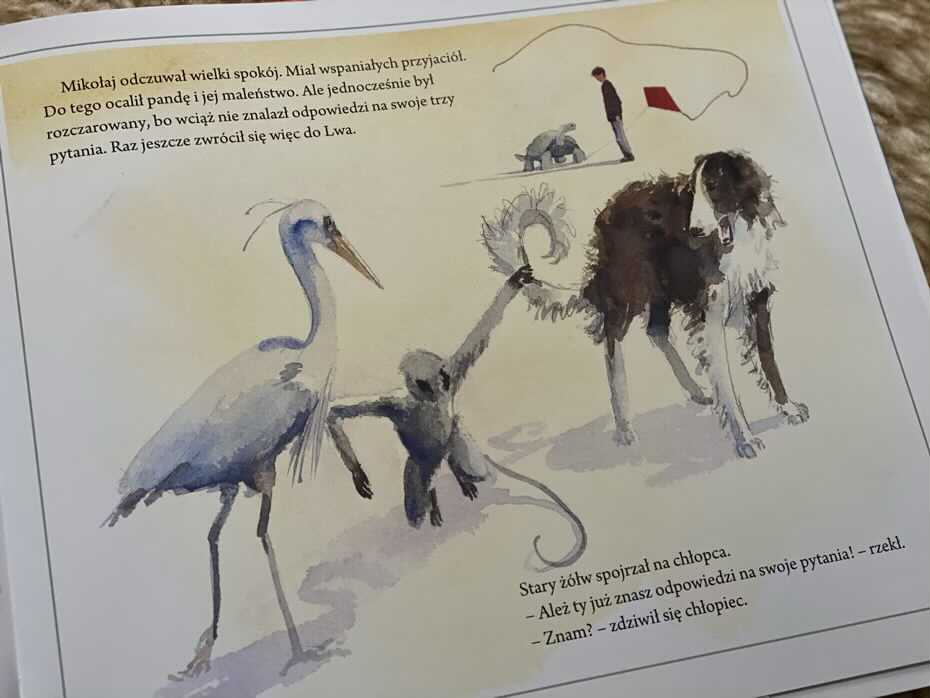 Pyta swoich zwierzęcych przyjaciół, którzy uważnie go słuchają i odpowiadają, jak umieją najlepiej. Kiedy czapla Sonia, małpa Gogol i pies Puszkin nie mogą udzielić mu zadowalających odpowiedzi, Mikołaj wyrusza do górskiego domu żółwia Lwa. Kiedy chłopiec przybywa, żółw akurat stara się kopać w swoim ogrodzie. Widząc powolnego Lwa, Mikołaj spieszy mu z pomocą. Gdy kończą pracę, nadchodzi gwałtowna burza. Chłopiec biegnie do chaty Lwa, ale po drodze słyszy wołanie o pomoc rannej pandy. Mikołaj przyprowadza ją do suchego pomieszczenia i dowiaduje się od niej, że zaginęło jej małe dziecko. Młodzieniec wybiega z powrotem na zewnątrz, aby uratować jej dziecko. Szybko odnajduje malucha i oddaje go w ramiona matki pandy.