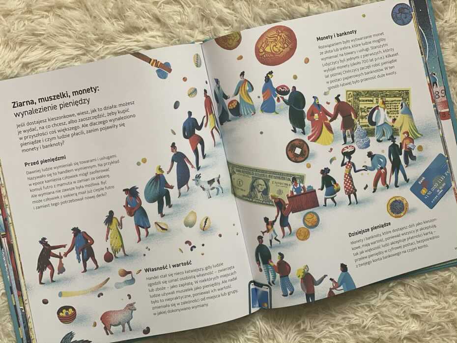 Książka dobrze podkreśla globalne pochodzenie wielu pojęć, których nadal używamy, od Indii i Egiptu po Grecję i Rzym, z ilustracjami ukazującymi różnorodność ludzi. Jedną z ciekawych stron jest wyjaśnienie dotyczące pieniędzy. W poprzek strony wije się długa kolejka ludzi, przedstawiająca różne rasy ludzi, negocjujących wymianę towarów. Początek linii zaczyna się w epoce kamienia łupanego, kiedy dwóch mężczyzn wymieniło skóry zwierząt na żywność i przechodzi przez historię po dziś, gdzie dwie osoby płacą kartami.