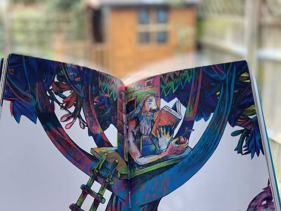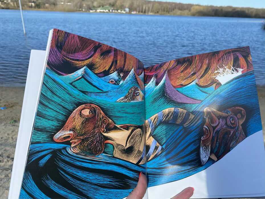 „Robinson Crusoe. Opowieść obrazkowa na podstawie dzieła Daniela Defoe” to bezdyskusyjny klasyk literatury młodzieżowej, a jednocześnie tekst literacki, który doczekał się niezliczonej liczby adaptacji, skrótów i parafraz. Każda rozkładówka jest całostronicową, innowacyjną ilustracją w ekspresjonistycznym stylu, pokazująca dzieje rozbitka. Te monumentalne i dynamiczne rysunki wywołują wrażenie ruchu na poszczególnych planszach. Studiowanie każdej strony daje wyobrażenie całej historii, jaką Robinson przeżył na bezludnej wyspie. Według mnie jest to ciekawa pozycja i cieszę się, że mogliśmy przyglądać się szczegółom i opowiadać swoimi słowami co jest zamieszczone na kartach. Lektura niezwykle pobudza wyobraźnię. Adaś nie miał jeszcze okazji poznać oryginalnej opowieści o Crusoe, ale trafnie nadawał obrót akcji. Dlatego też polecam książkę jako pomoc obrazkową do pobudzenia wyobraźni i zachwycania się dziełem sztuki, jakie mamy przed sobą.