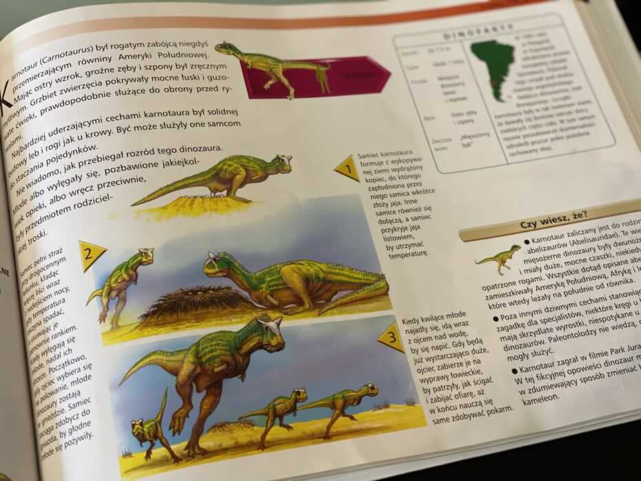 Z książki czytelnicy odkryją fantastyczne, niezwykłe i dziwaczne typy dinozaurów, które niegdyś wędrowały po Ziemi. Każda rozkładówka zawiera łatwy do zrozumienia tekst, mapy lokalizacyjne i pola informacyjne (z rozmiarem, wagą, dietą i znaczeniem imienia każdego dinozaura). Bardzo realistyczne ilustracje, pełne kolorów i zachowań drapieżników trafnie opowiadają o danym zwierzęciu. Fajnym punktem na stronie jest wymiar opisywanego zwierzęcia w stosunku do dorosłego człowieka, co bardzo pomaga wyobrazić sobie rozmiar danego gatunku.