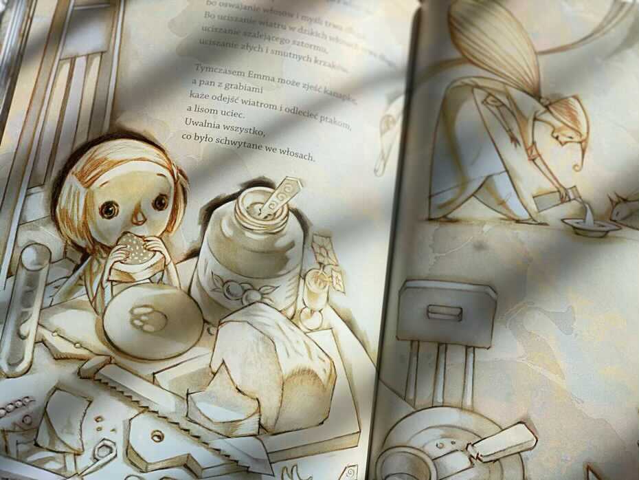 Mała dziewczynka widzi duże i rozczochrane włosy i stara się uporządkować je małą szczoteczką. Emma myśli, że skoro ma taki bałagan na głowie, to chyba trudno jej myśleć i ma złe pomysły. Widzi, że im gorsze włosy, tym smutniejszy stan matki. Gdy próbuje pomóc matce, pojawia się mężczyzna z grabiami w dłoni. Początkowo Emma była przestraszona, ale w końcu zrozumiała, że pojawił się on po to, aby pomóc im obu. Jegomość tłumaczy, że potrzeba czegoś więcej niż tylko szczotki, kiedy myśli są skłębione, uczucia splątane, a sprawy zasupłane.