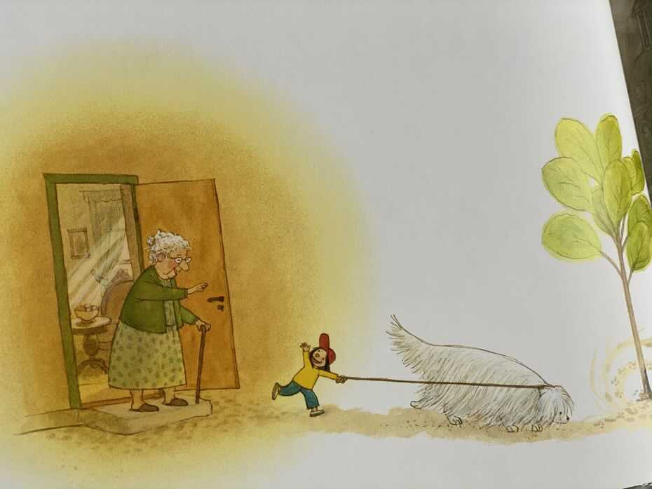 Jak sugeruje tytuł tej historii, książka zabiera nas na spacer. Początkowo nie zdradza, dokąd się wybieramy. Raczej zapoznaje z nowymi towarzyszami – małym chłopcem w czerwonej czapce z daszkiem oraz z dużym, białym, puszystym psem.