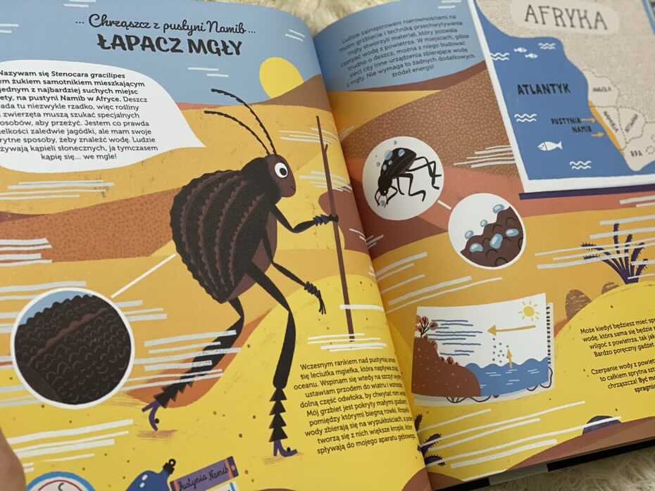 W tej książce czytelnicy poznają zwierzęcych wynalazców, którzy podzielili się z ludźmi swoimi supermocami do tworzenia niesamowitych rzeczy. Ponad 30 różnych gatunków przedstawia to, w czym dana umiejętność może pomóc ludzkości. Rekiny zainspirowały nowoczesne stroje kąpielowe, a koniki morskie nauczyły nas budowania lepszych i mocniejszych maszyn. Bobry zainspirowały ludzi ochroną przed powodzią, a ważki stały się wzorem do stworzenia dronów. Żaba drzewna dzięki wyjątkowej konstrukcji podeszew stóp przyczyniła się do powstania opon lepiej trzymających się mokrej powierzchni. Ślimak wynalazł dom, w którym nawet na gorącej pustyni panuje chłód. Szarańcza pomogła nam zbudować bezpieczniejsze samochody. Termity przyczyniły się do chłodzenia domów, a chrząszcz z pustyni Namib do czerpania wody z powietrza. To tylko kilka przykładów z udziałem zwierzęcych bohaterów i zapewniam Was, jest ich znacznie więcej do poznania.