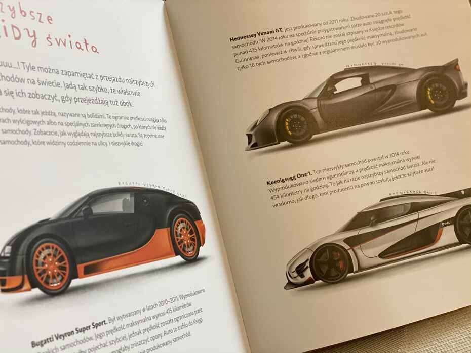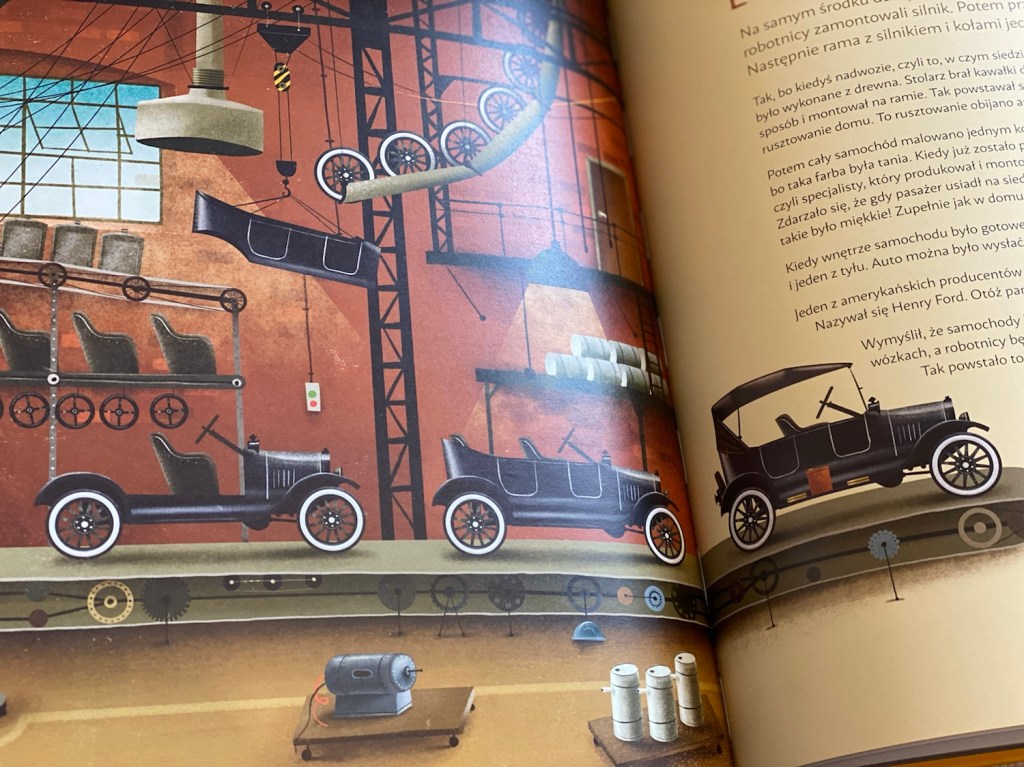 Mali czytelnicy zapoznają się ze słowniczkiem motoryzacyjnym, nazewnictwem przyrządów potrzebnych do naprawy auta czy pierwszymi znakami drogowymi. Przyglądną się także pierwszym wyścigom samochodowym oraz przedwojennej wyprawie polskich harcerzy Fordem T dookoła świata.