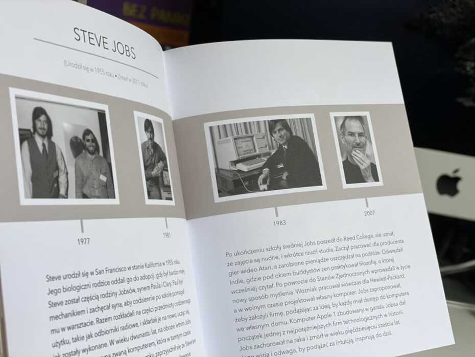 Zaskoczyło mnie, jak wiele informacji z życia Jobsa można znaleźć w tak małej książeczce. Począwszy od wspierających go rodzicach adopcyjnych, kursie medytacji, a skończywszy na pokazywaniu, jak ważna jest również nauka praktyczna i jak może ona prowadzić do wielkiego sukcesu w życiu.