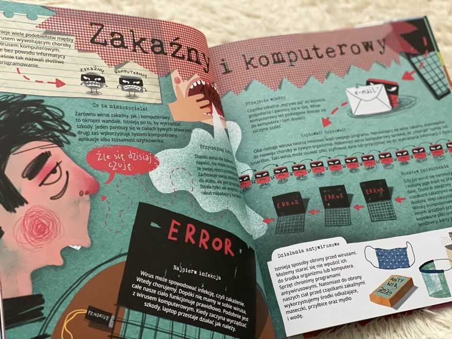 Publikacja przepełniona jest kolorami i ciekawymi rysunkami. Mali czytelnicy wertując strony, wzbogacą swoją wiedzę nie tylko o wirusach i bakteriach, ale także dowiedzą się co robić, aby wzmocnić swoją odporność. Dzieci poznają terminy, takie jak pandemia, epidemia czy kwarantanna. Dowiedzą się, czym różnią się wirusy od bakterii i innych organizmów. Przeczytają także o infekcji komputerowej, budowie wirusa, rodzajach bakterii, rodzinie koronawirusa, a nawet jego mutacji.